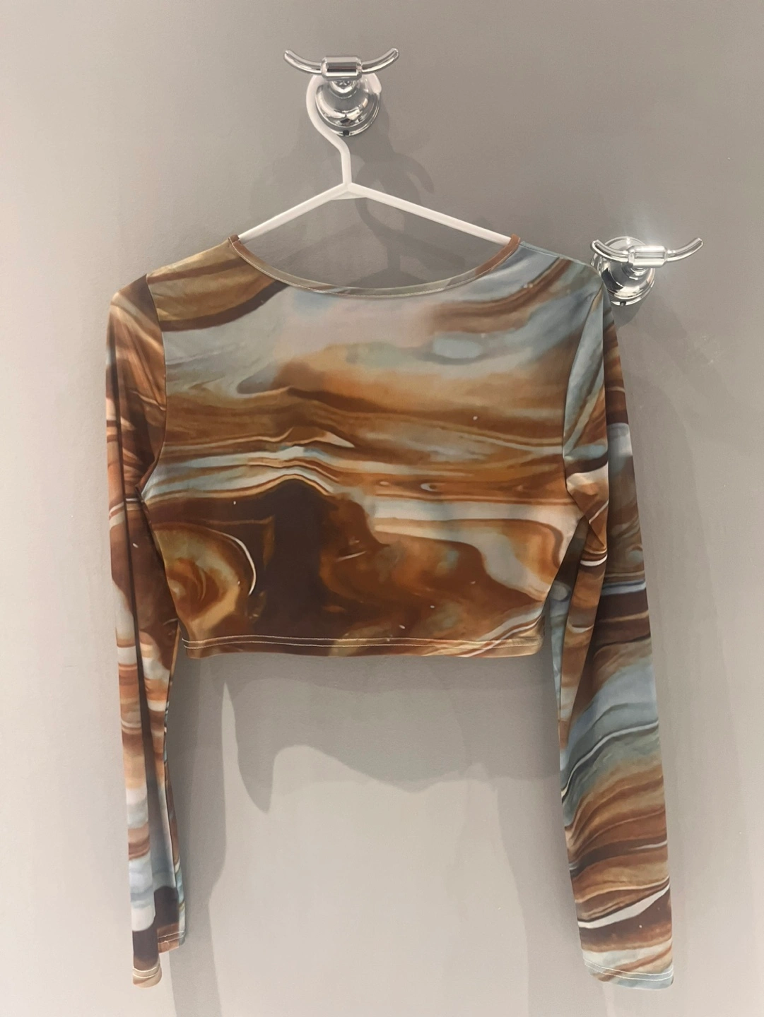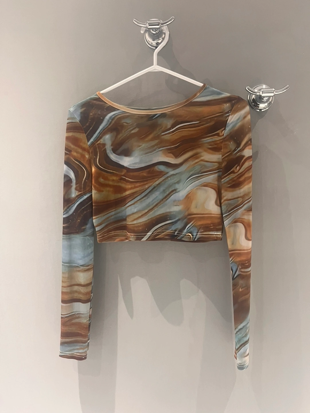 Long sleeve crop top with a brown and blue marble print. Very stretchy and comfortable. Size fits medium (has no label)