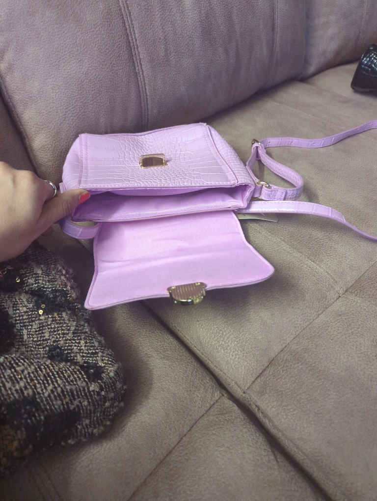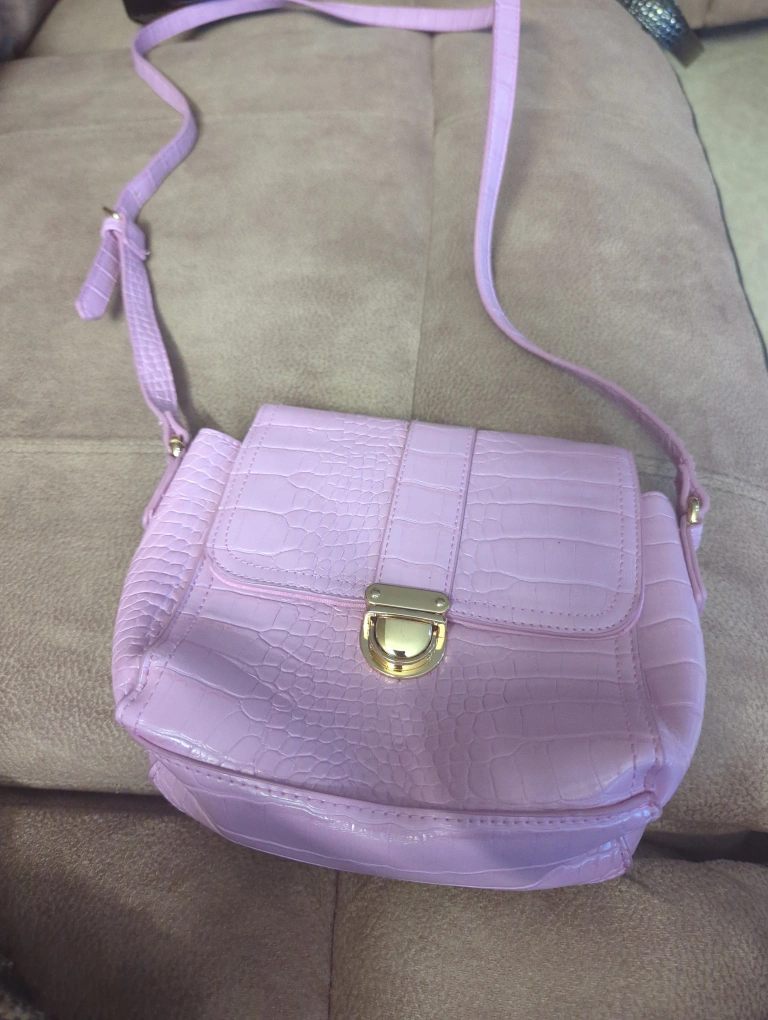 Small pink crossbody bag with a faux leather crocodile texture. Has an adjustable strap.