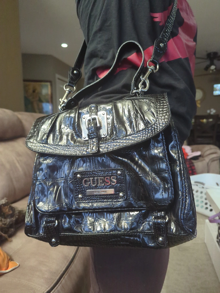 Black Guess handbag with crocodile pattern. Has a crossbody strap and top handle. Includes a small zippered pocket inside.