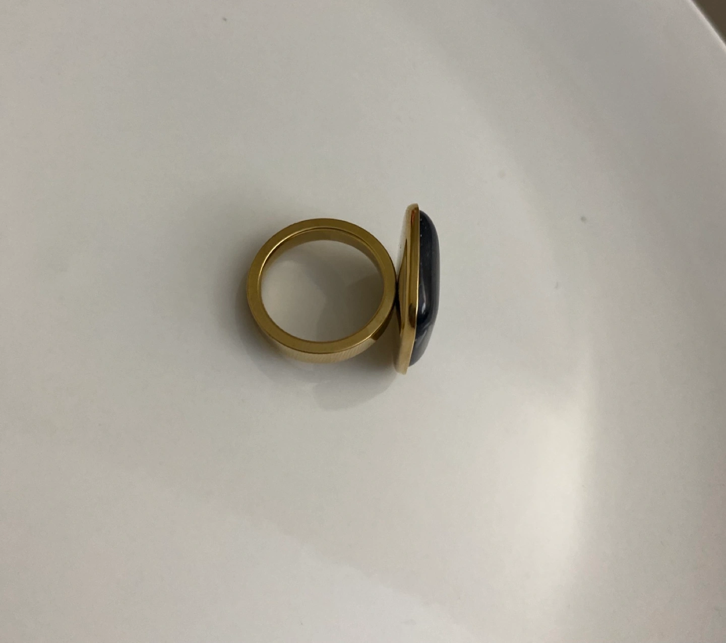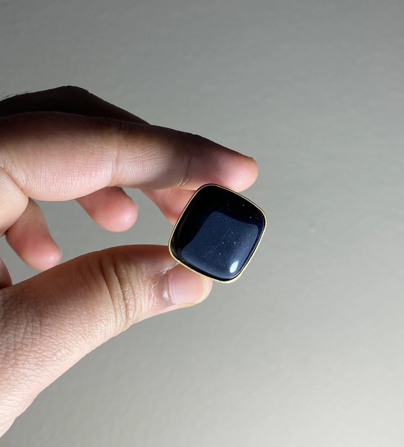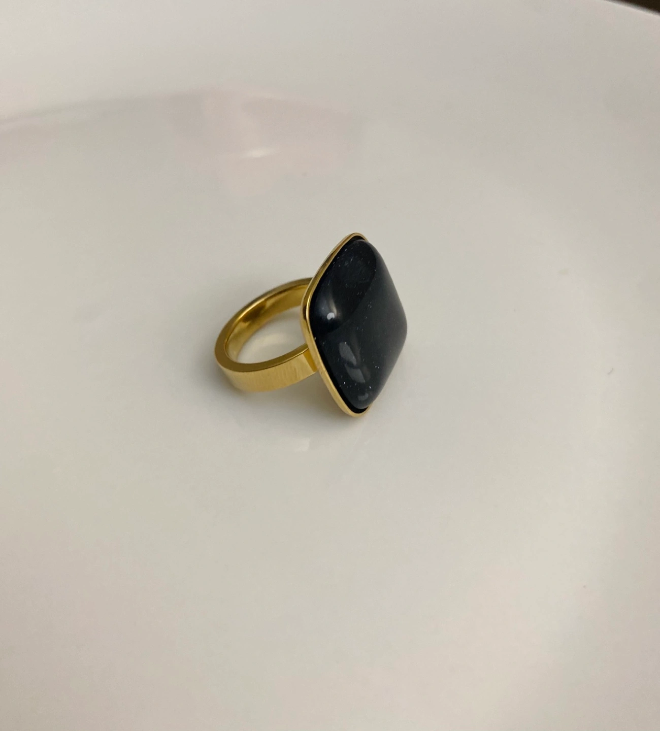 Gold ring with a navy blue stone, square shape.