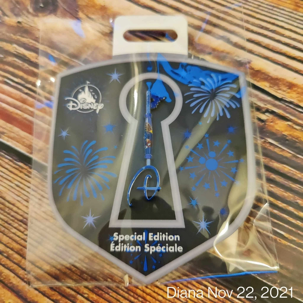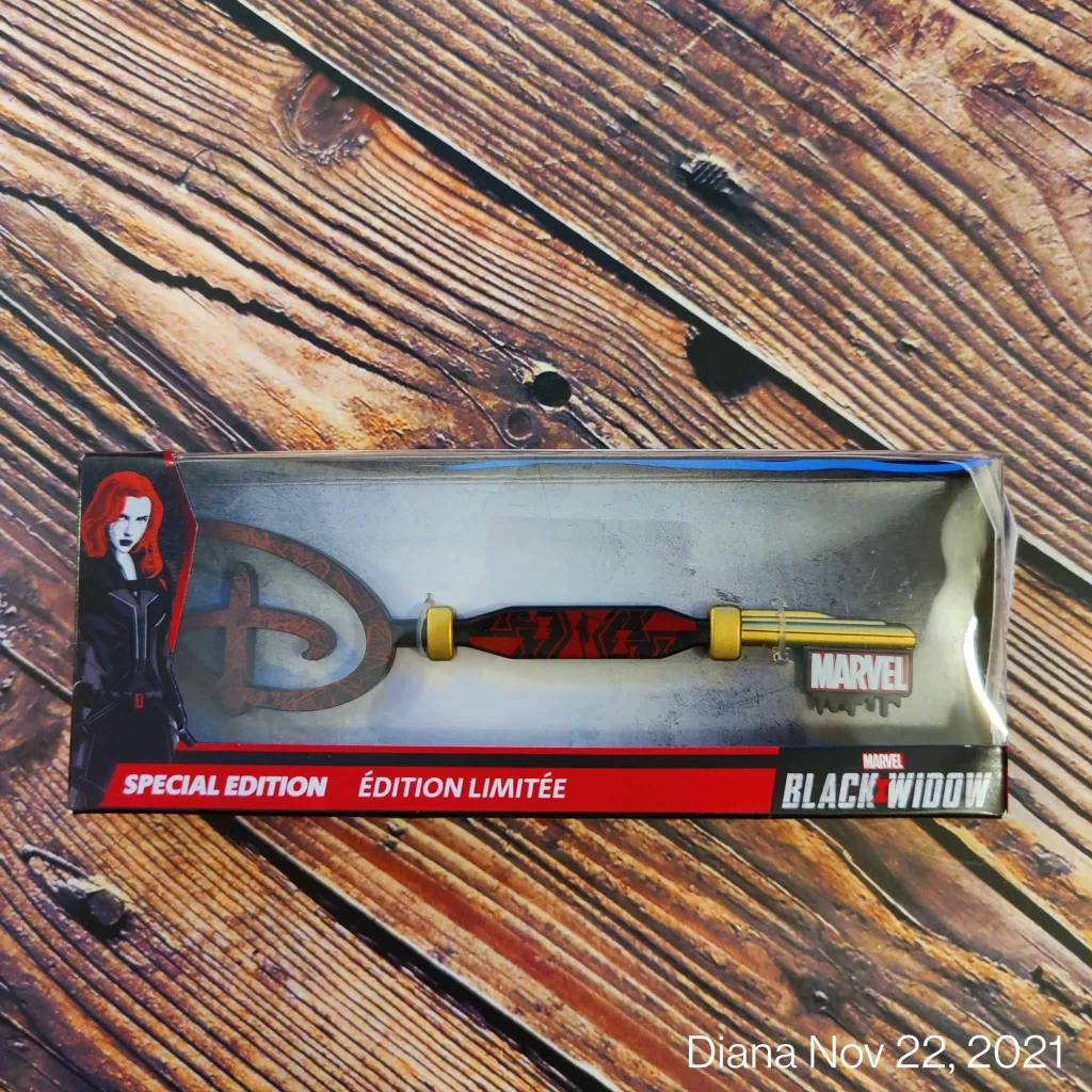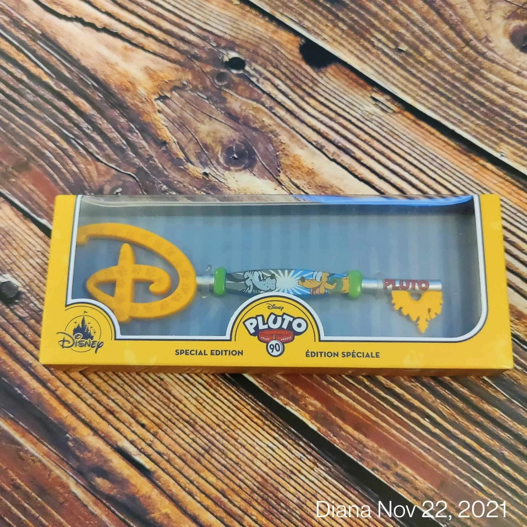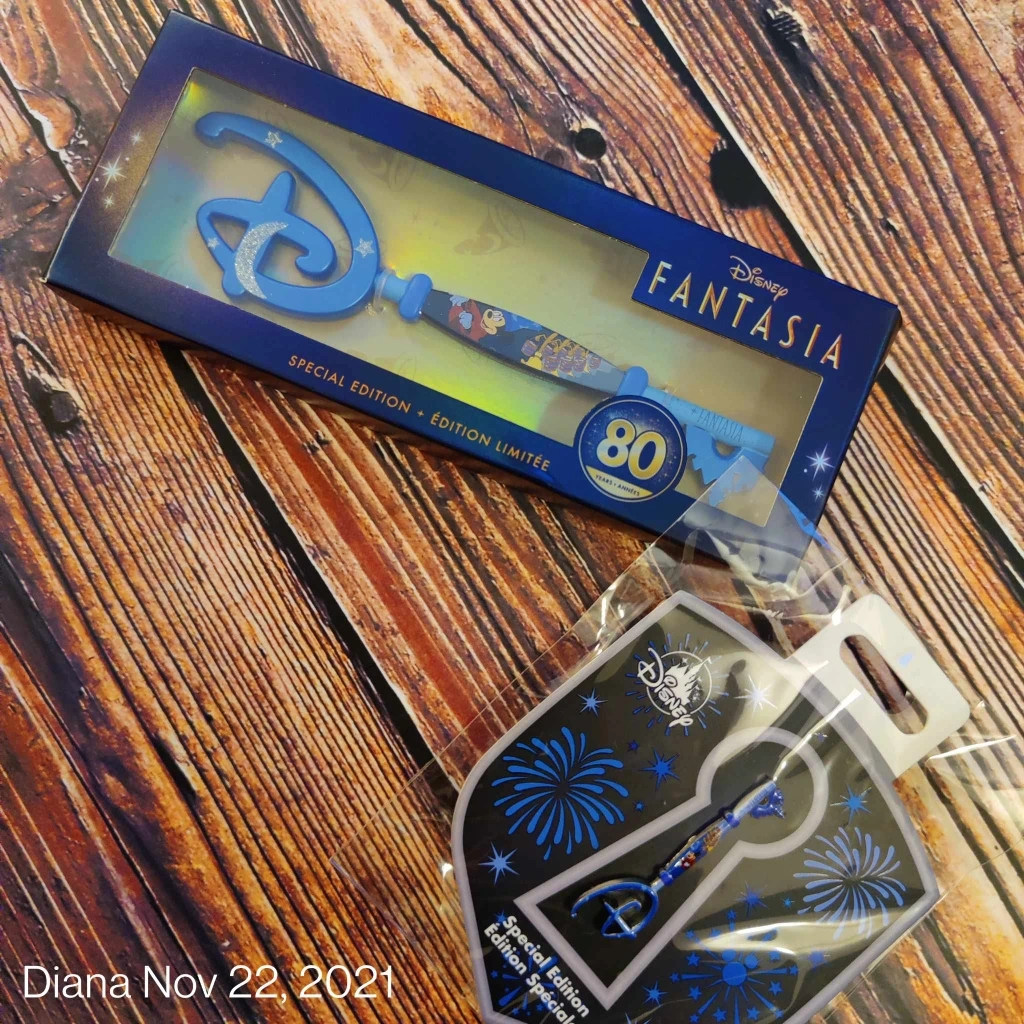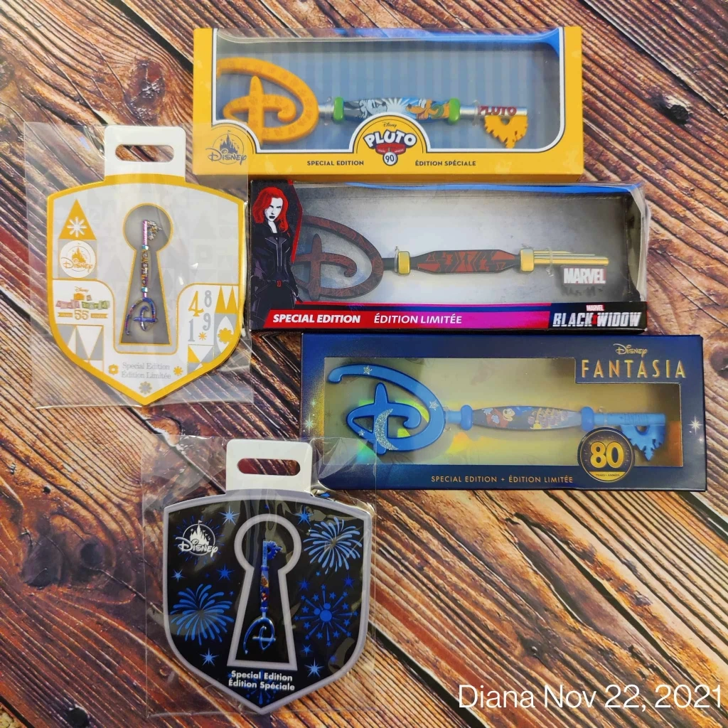 Four Disney park keys, each in a special edition box. All keys are new and in their original packaging. One key features a Fantasia design, another features a Black Widow design, another features Pluto, and the last features a keyhole with fireworks.