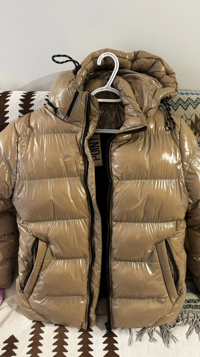 - Shiny puffer jacket with a hood and soft faux fur lining inside.