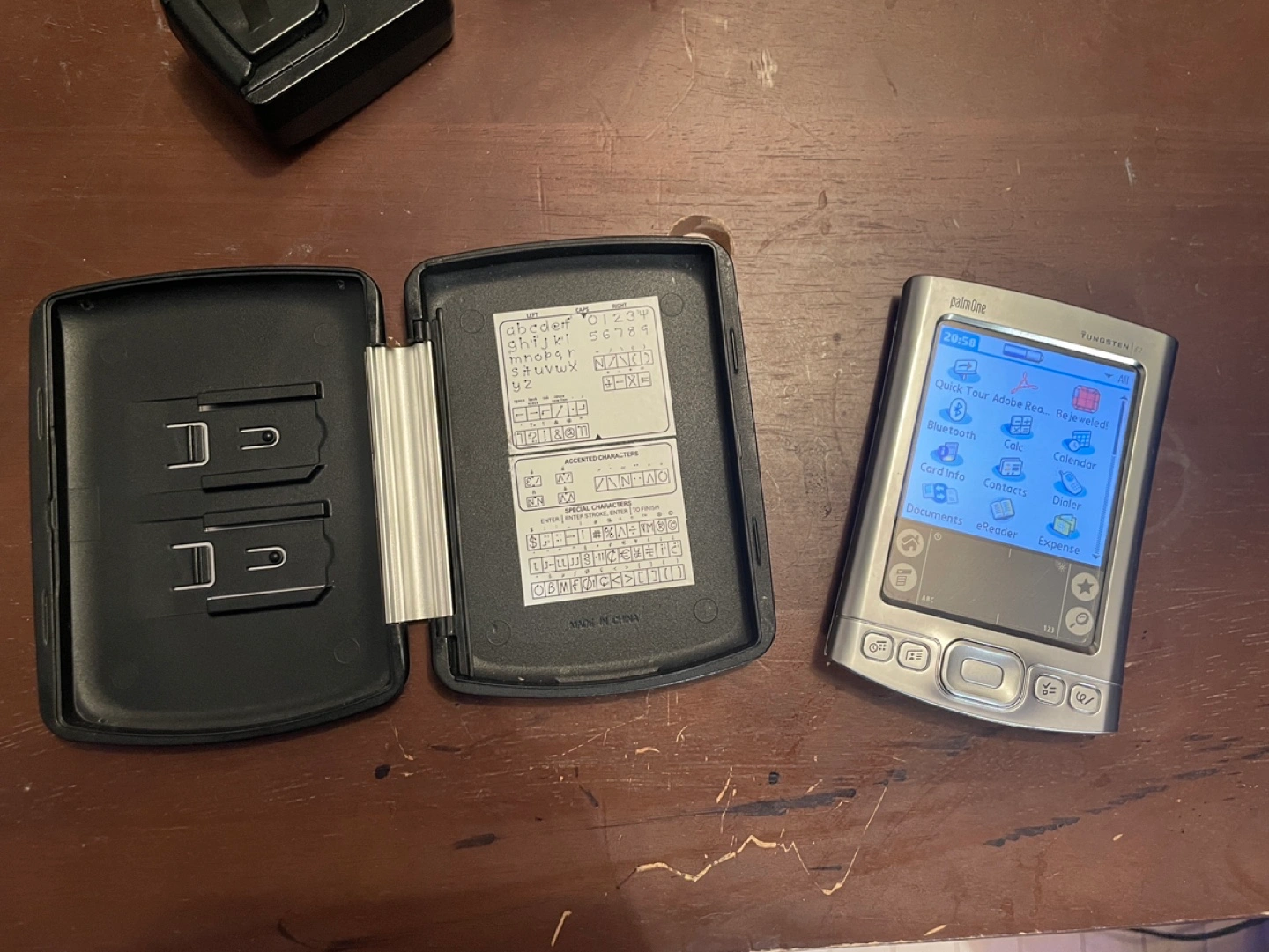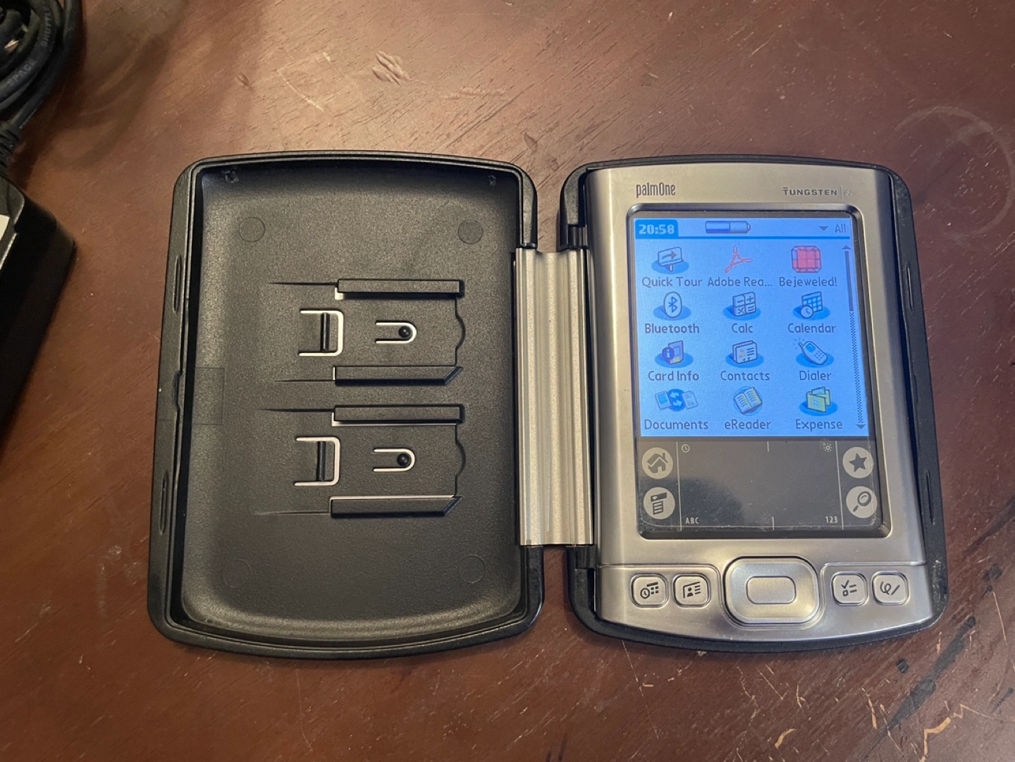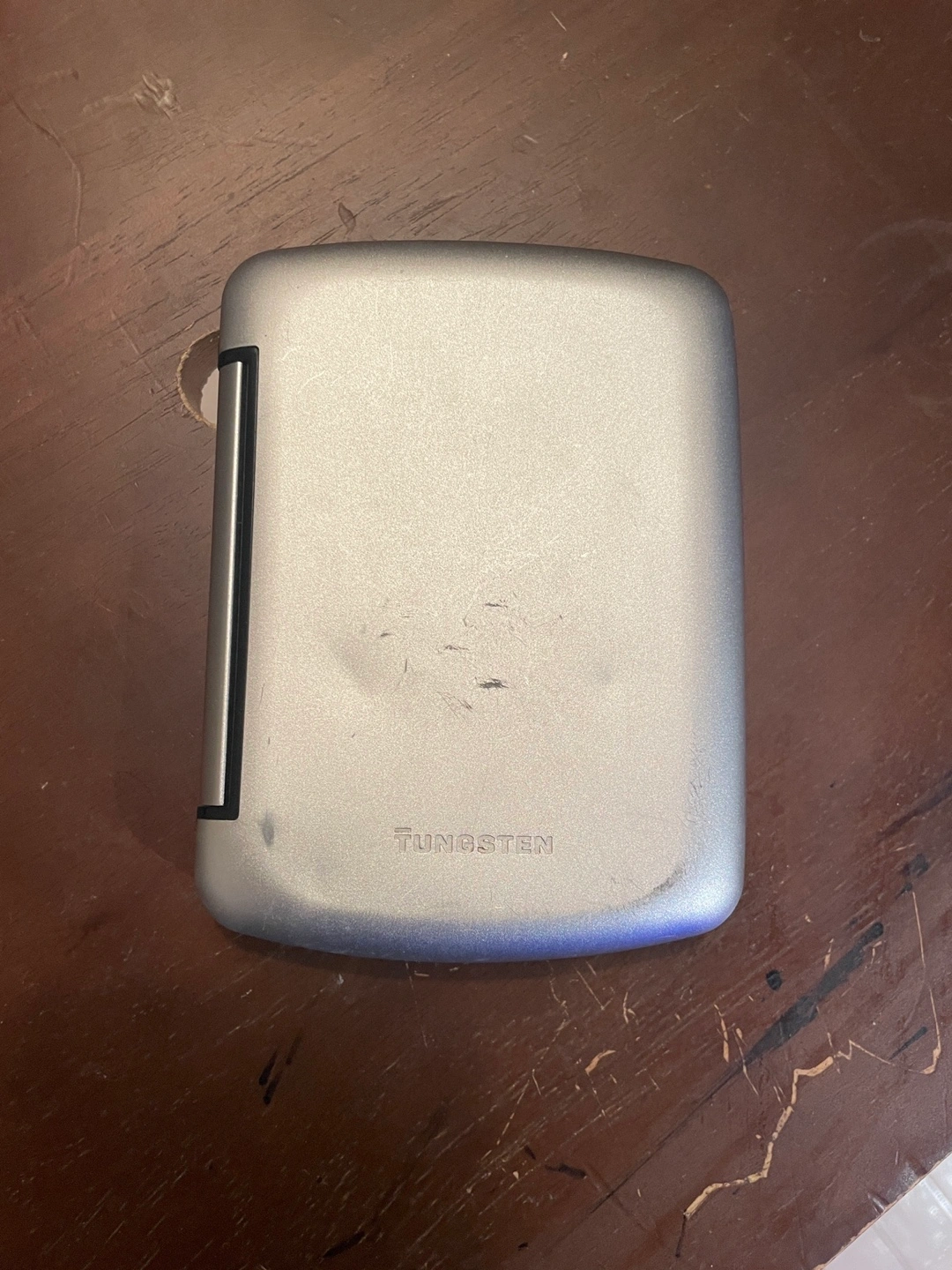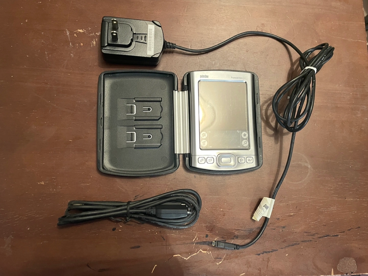 Palm Tungsten E2 PDA with case, charger and USB cable. Includes a stylus. Still works. Colour LCD backlit screen. All personal data has been wiped. Also has “dummy” SD card in slot to keep out dust.