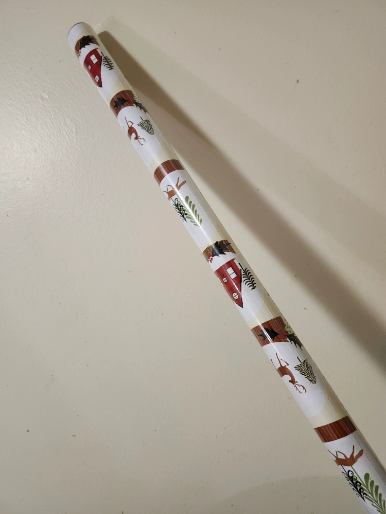 Wrapping paper roll featuring a cream background with red houses, deer, and brown stripes.