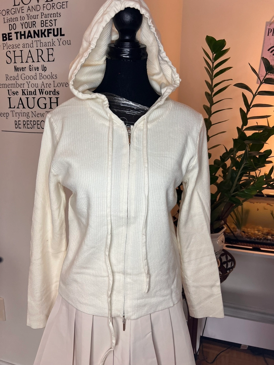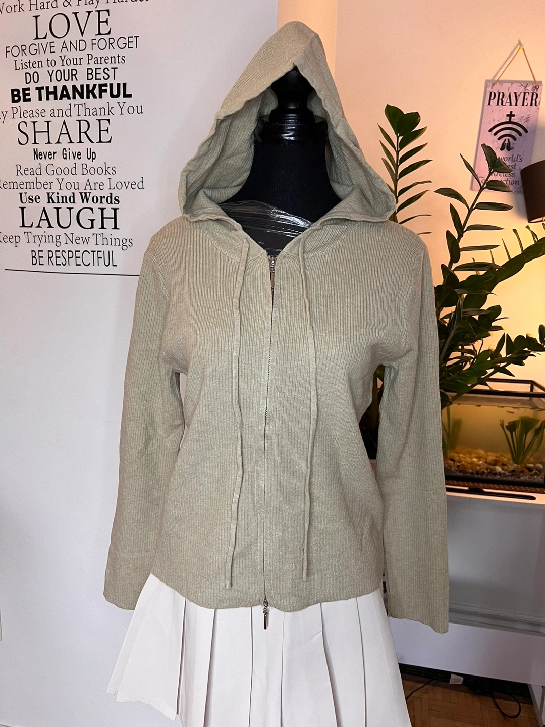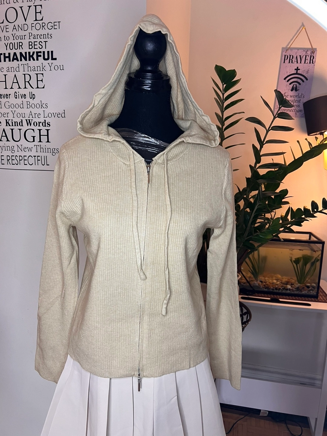 Long sleeve sweater with a hood and a zipper. Ribbed knit fabric.