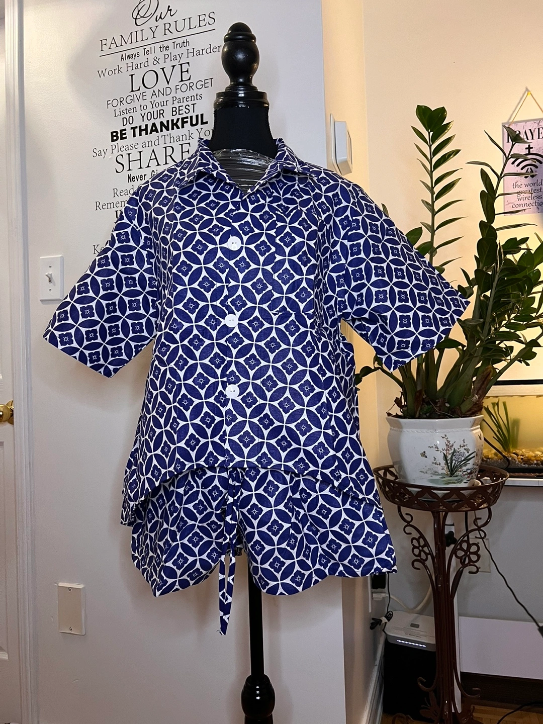 Short sleeve top and shorts. Watermelon print on one set and a blue floral print on the other.