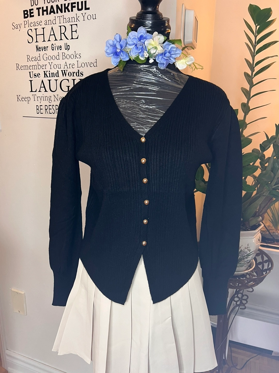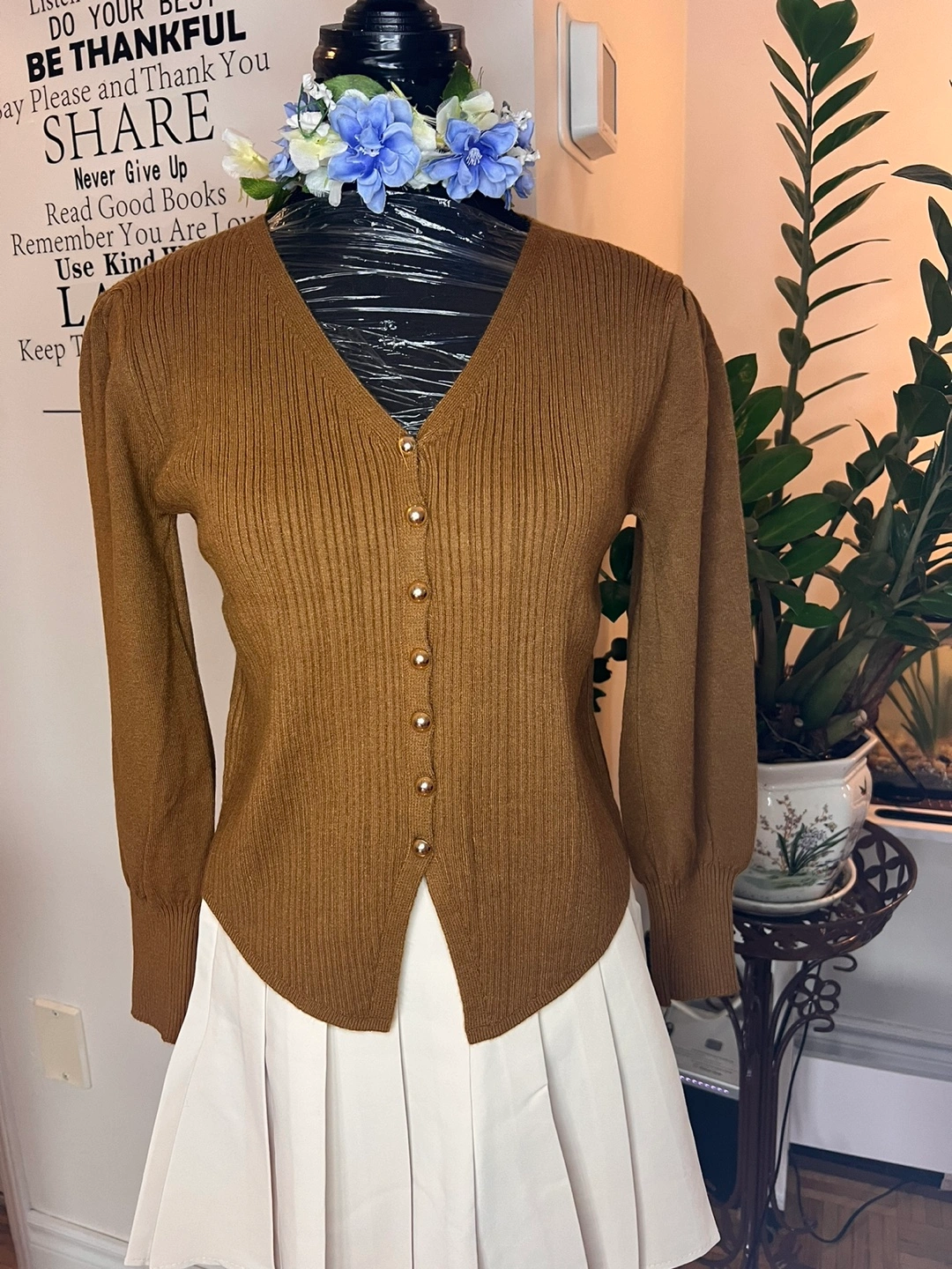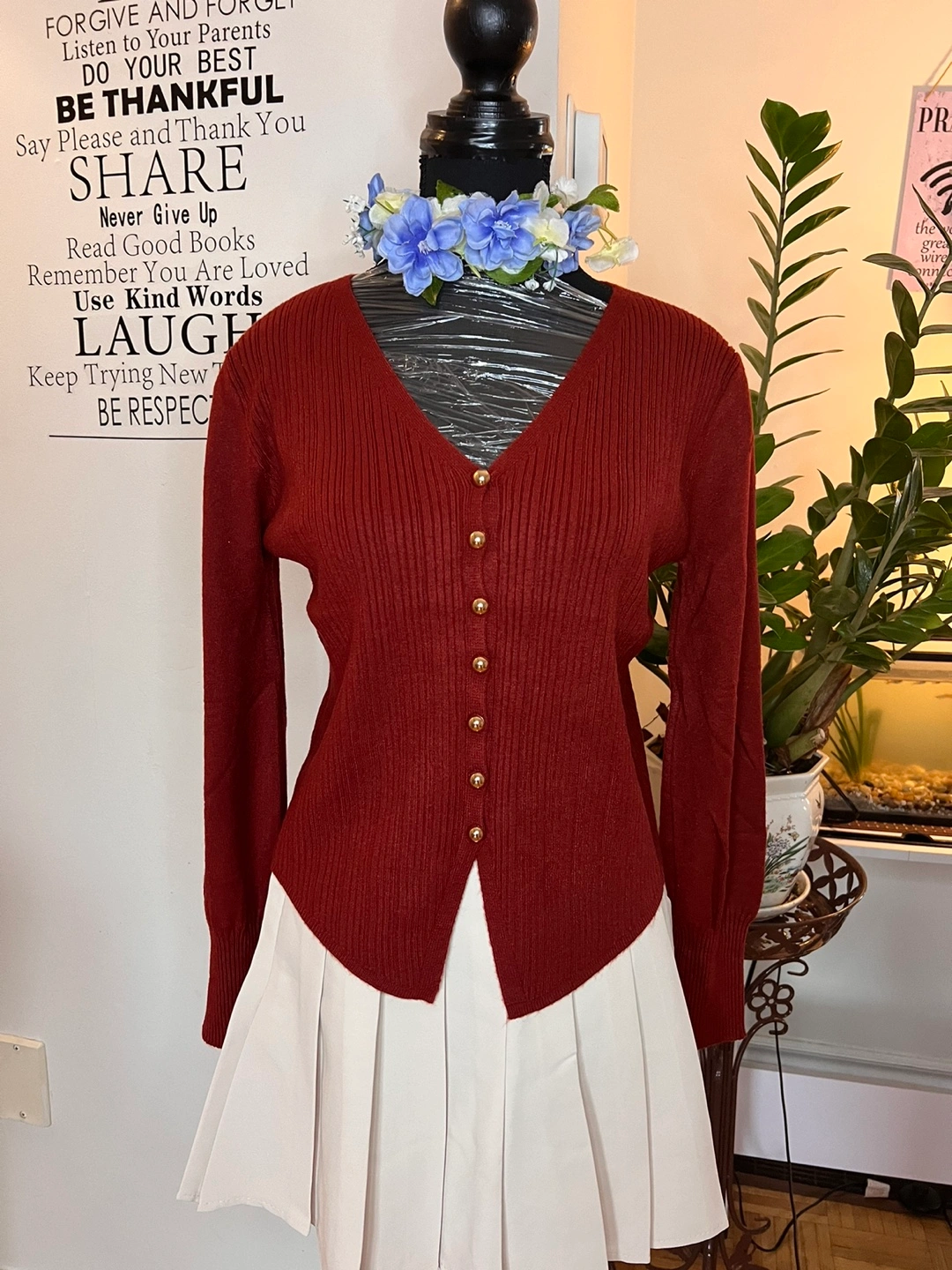 Long sleeve cardigan sweater with button closure. V-neck and ribbed material. Available in brown, black, and red.