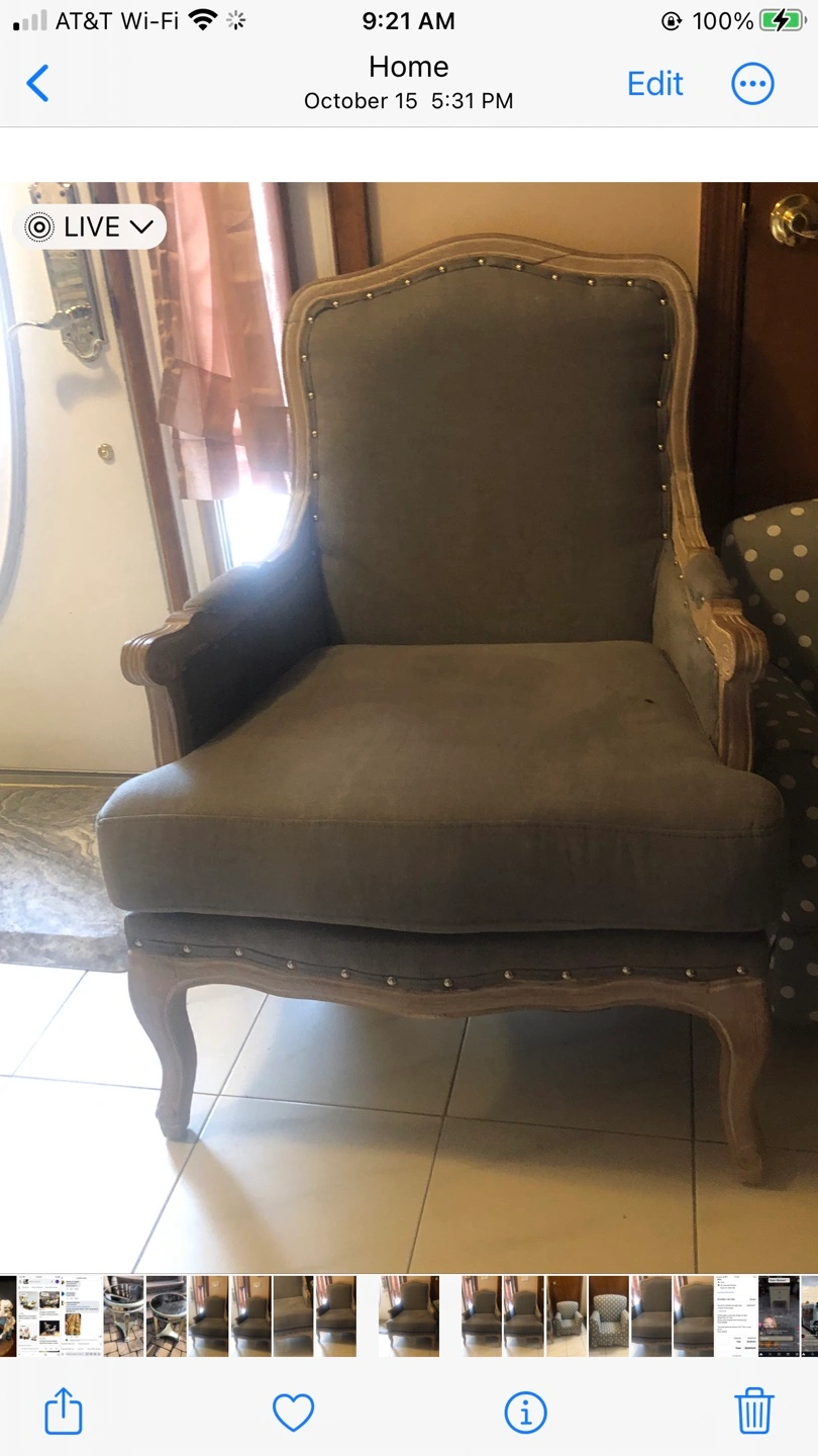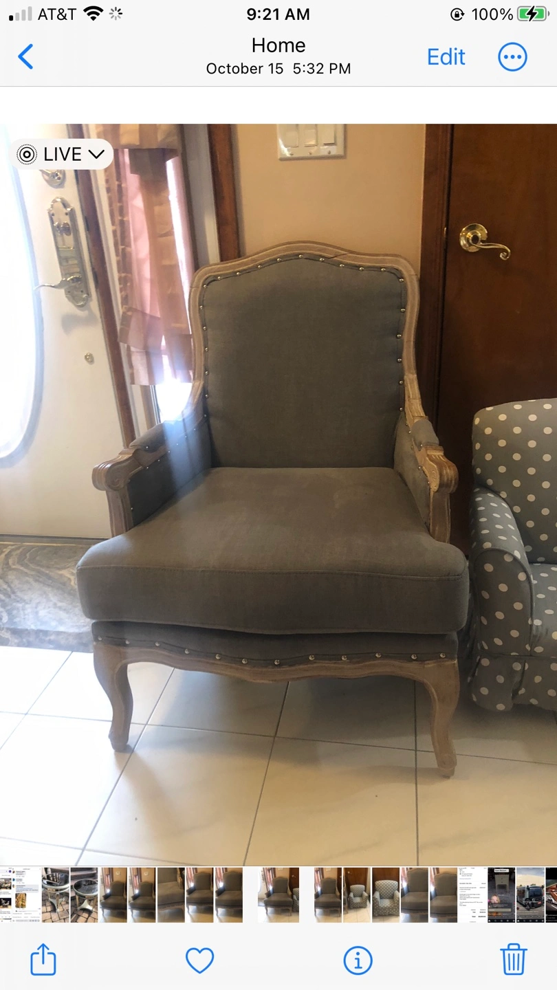 Gray upholstered accent chair with wooden frame. Features nailhead trim. Looks to be in good condition.
