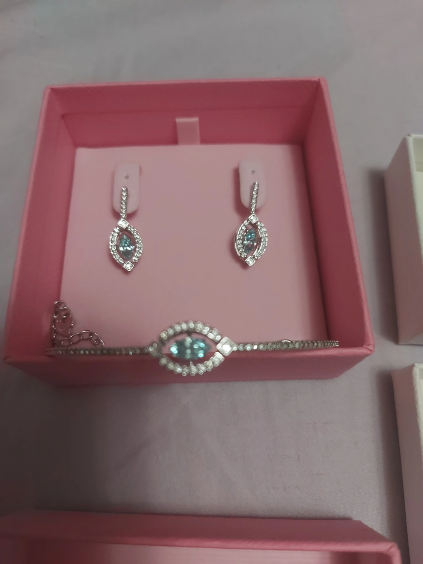 Swarovski jewelry set featuring a blue eye pendant. Includes necklace, bracelet and earrings. Each piece has a floating blue jewel.