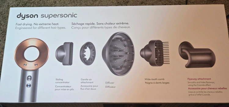Hair dryer with various attachments, including a styling concentrator, gentle air attachment, diffuser, wide-tooth comb, and flyaway attachment. still in box never been opened