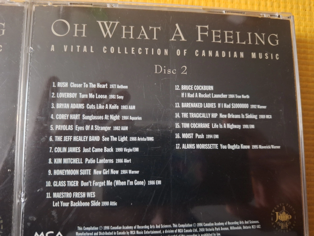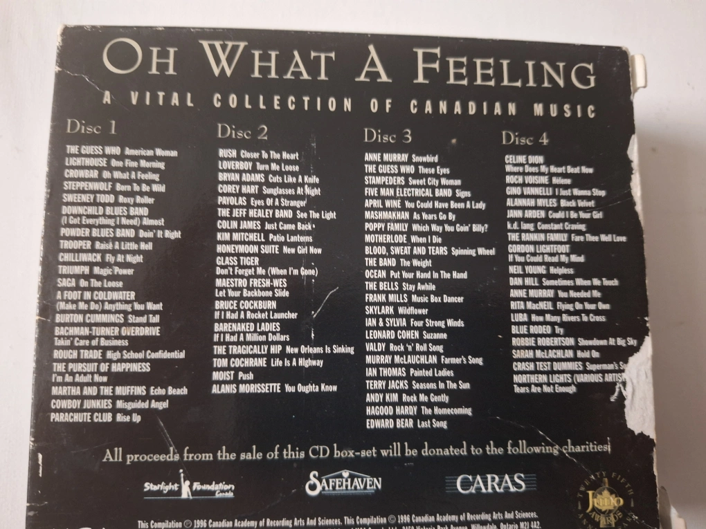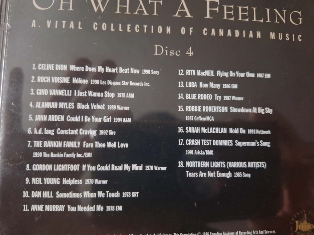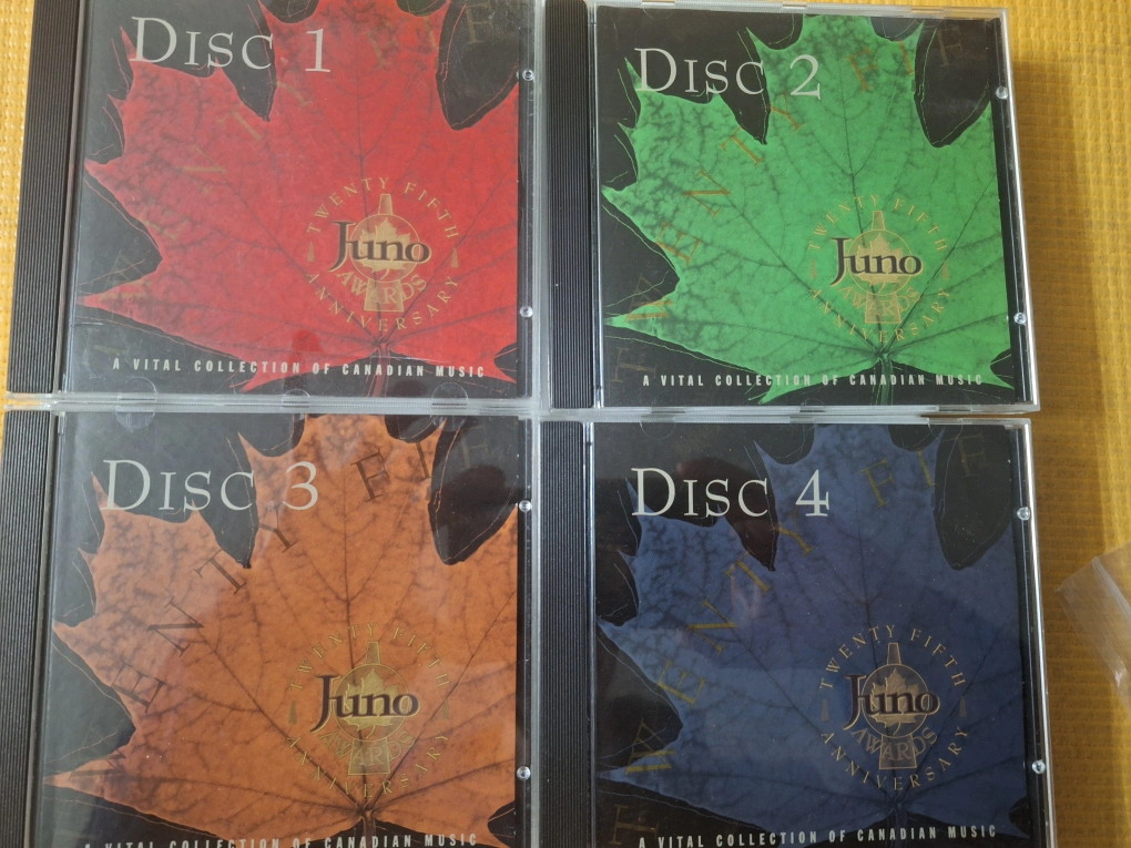 Four CD set of Canadian music celebrating the 25th anniversary of the Juno Awards. Includes artists such as Celine Dion, Bryan Adams, The Guess Who, and many more.