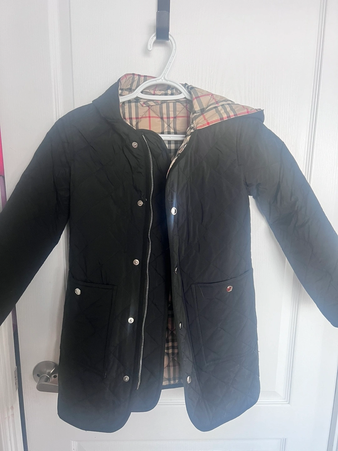 112Black quilted jacket. Features a reversible design with the Burberry check pattern on one side. Size 8-10 (140 cm).