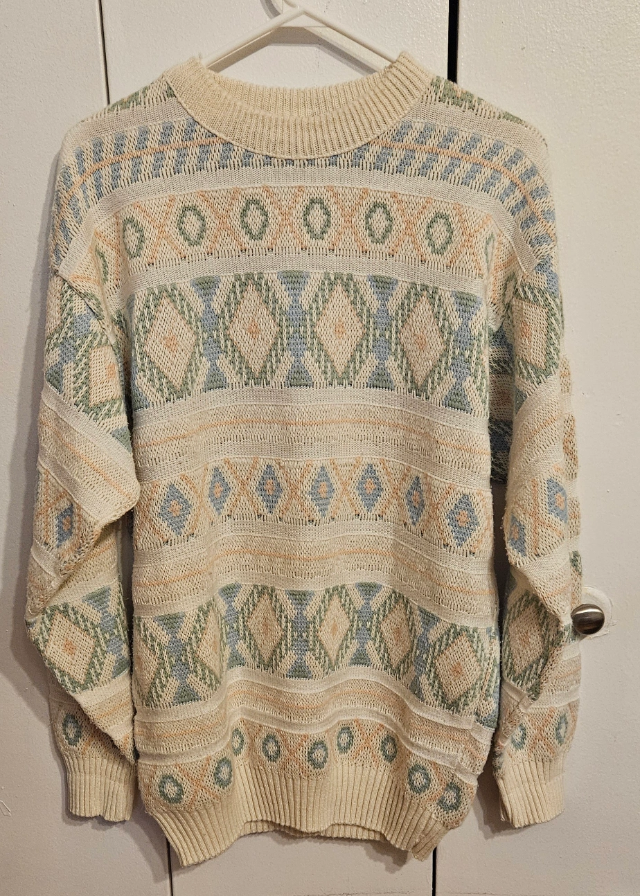 1000+Cream coloured sweater with a blue, green, and peach geometric pattern. Long sleeves and a crew neck. Thrifted from a vintage store years ago, never wore it and now it's too small :(