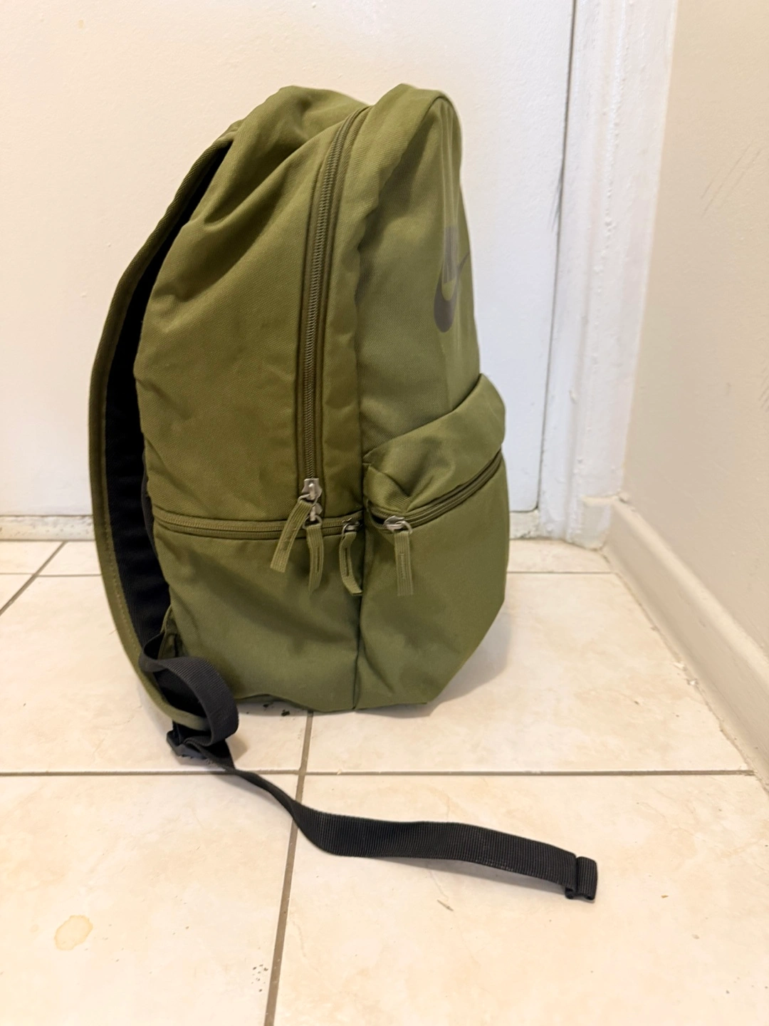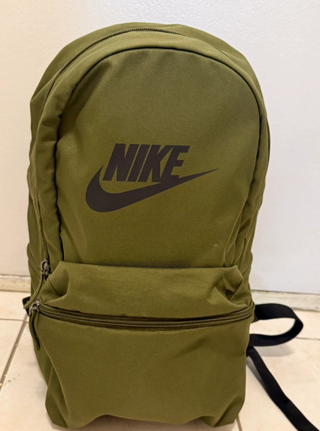 Green backpack with black straps and a large Nike logo on the front. Has a front pocket and padded straps. Brand : Nike