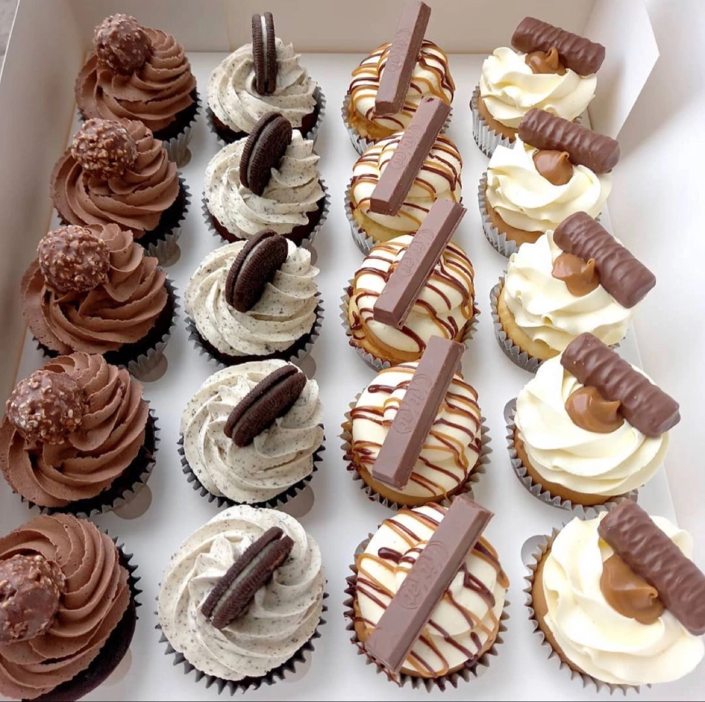 Box of assorted cupcakes: chocolate, vanilla, and caramel cake. Toppings include Twix, Kitkat, Oreo, Ferrero Rocher and each come with their own buttercream frosting and homemade caramel sauce. 80$ for 24 pcs. MADE FRESH TO ORDER