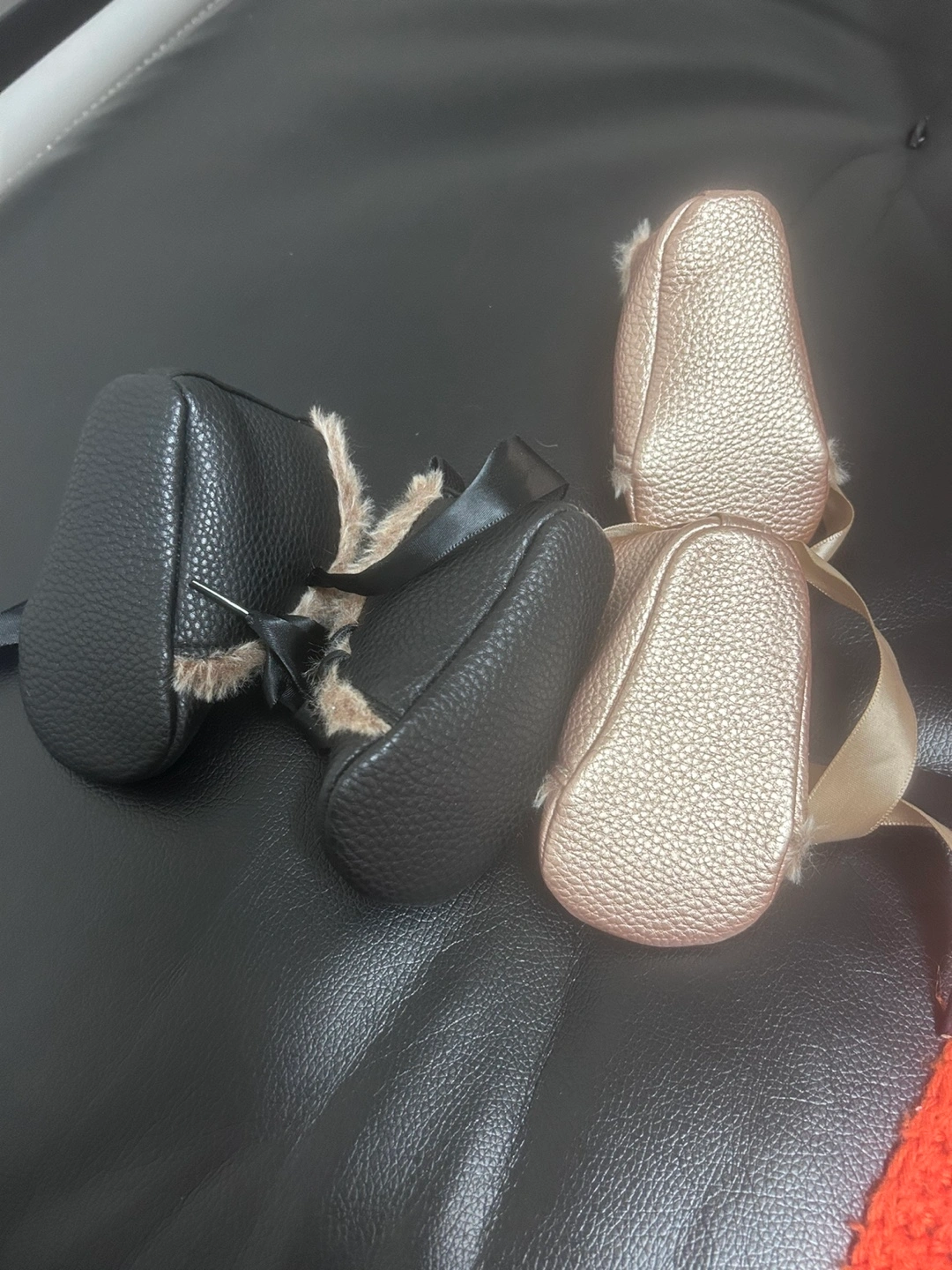 Pair of baby girl booties in black and gold. Faux fur trim. Ribbon ties.