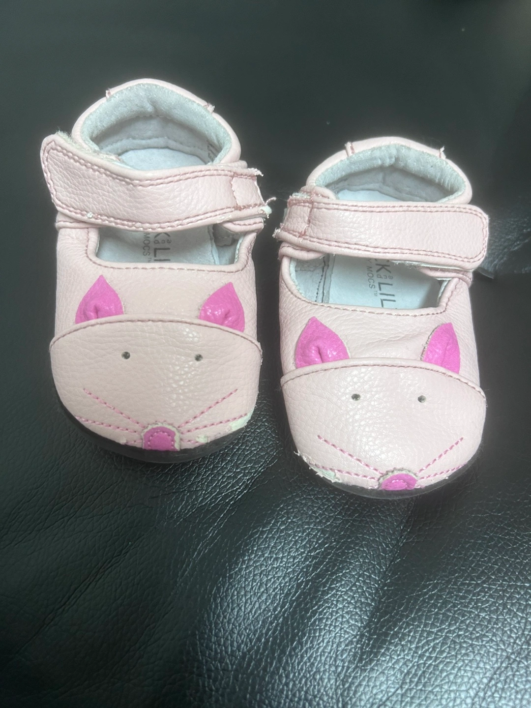 Pink leather baby shoes with a mouse design. Velcro closure. Soft and flexible.