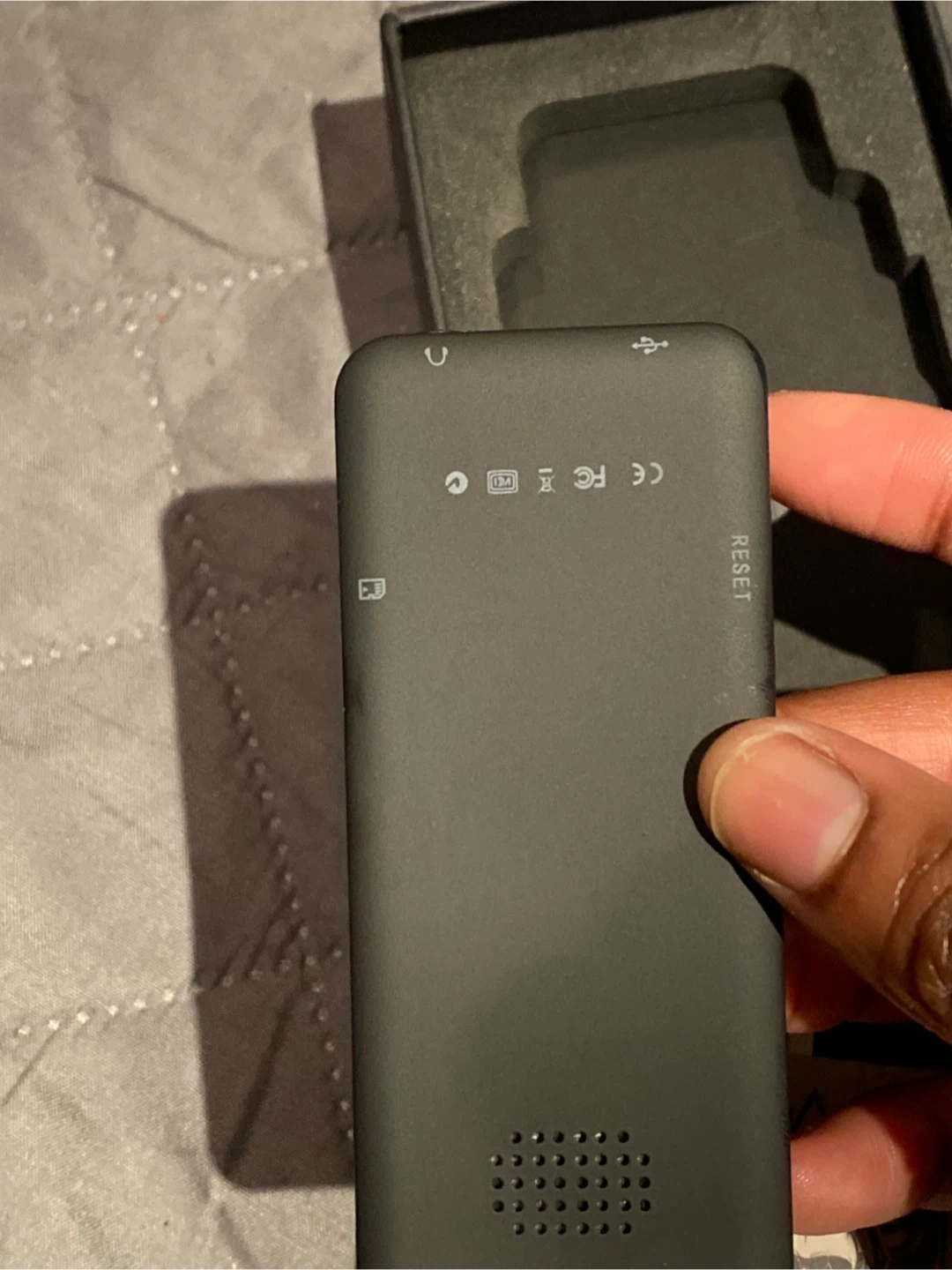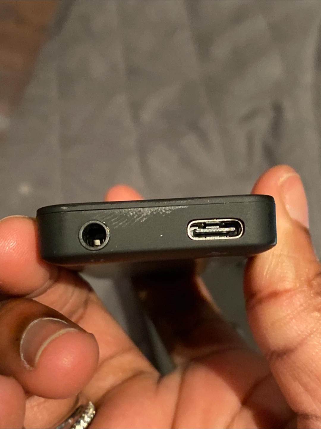 This is a Rockstar MP3 player in grey. It's a portable music device that fits in your pocket. It comes with a reset button and a USB-C charging port.