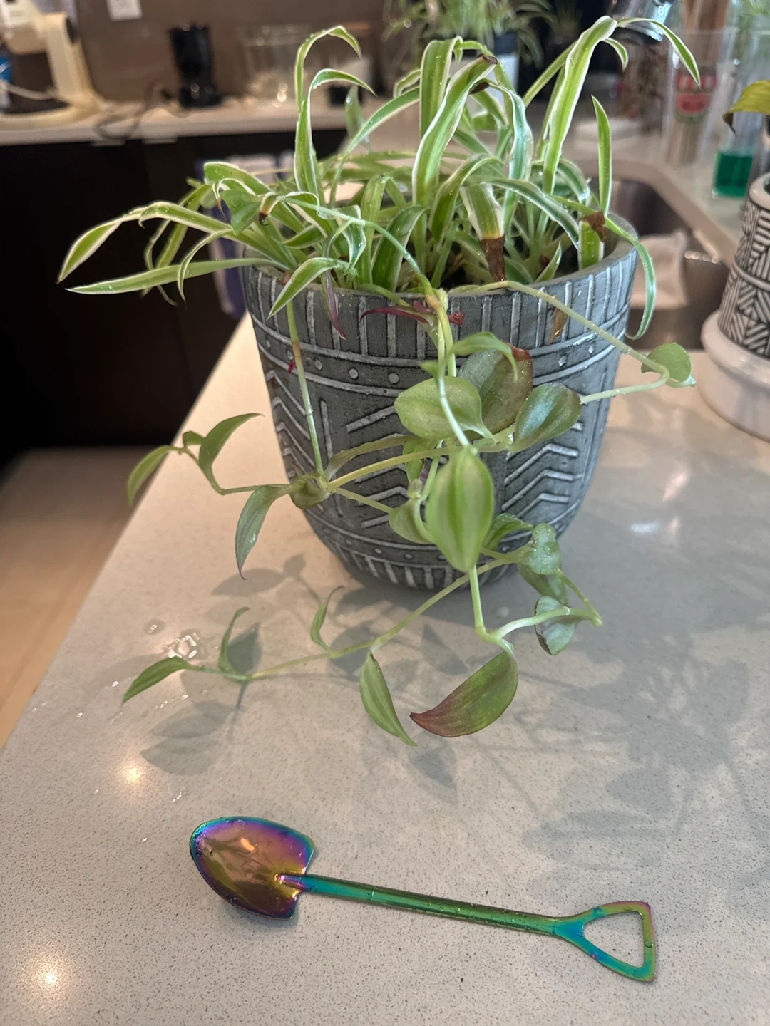 Spider plant in a grey decorative pot. It's a healthy plant with lots of new growth. Includes a small iridescent mini shovel. Pot has a textured geometric pattern.