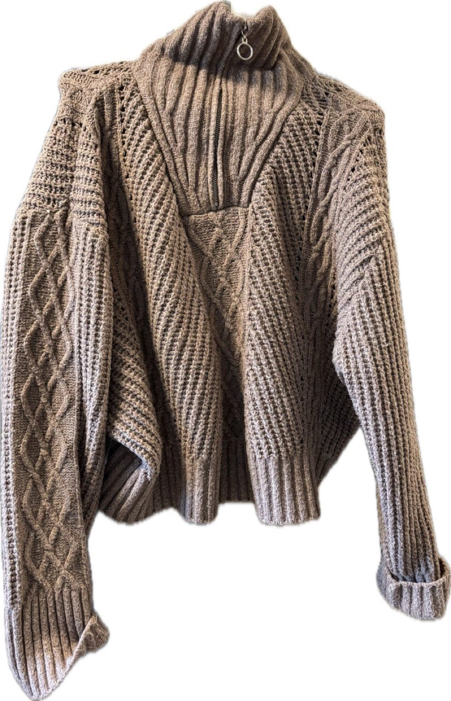 Brown cropped cable knit sweater with a high neck and a zipper. Long sleeves and a relaxed fit. Made in China.