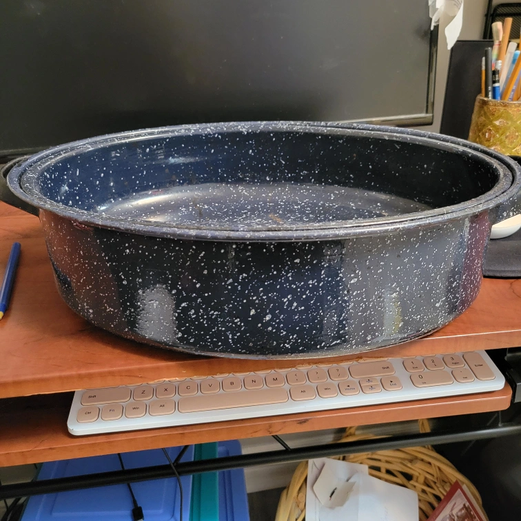 Large enamelware roaster with speckled blue and white finish. Shows signs of wear and tear, but is still functional.