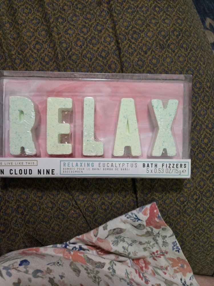 Bath fizzers shaped like the word relax. Five bath fizzers included.