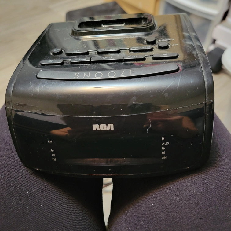 Black clock radio with alarm, sleep timer, snooze, and iPod dock. Includes AM/FM radio, auxiliary input, and shuffle/repeat functions.
