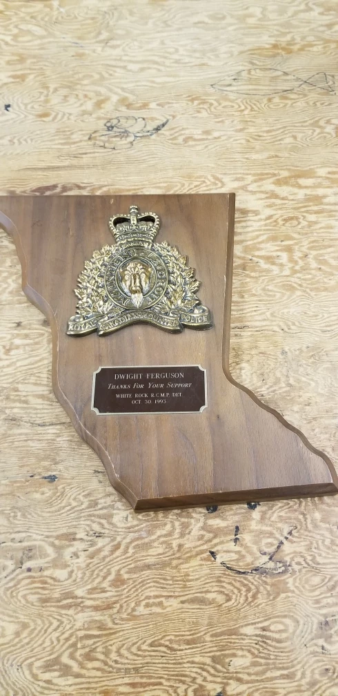 Plaque featuring the Royal Canadian Mounted Police crest. Includes a personalized inscription. it reads " Dwight Ferguson , thank you for your support , White Rock RCMP Det . Oct 30 1993 . Cash payment please . Thanks for looking . ( about a foot tall ) .
