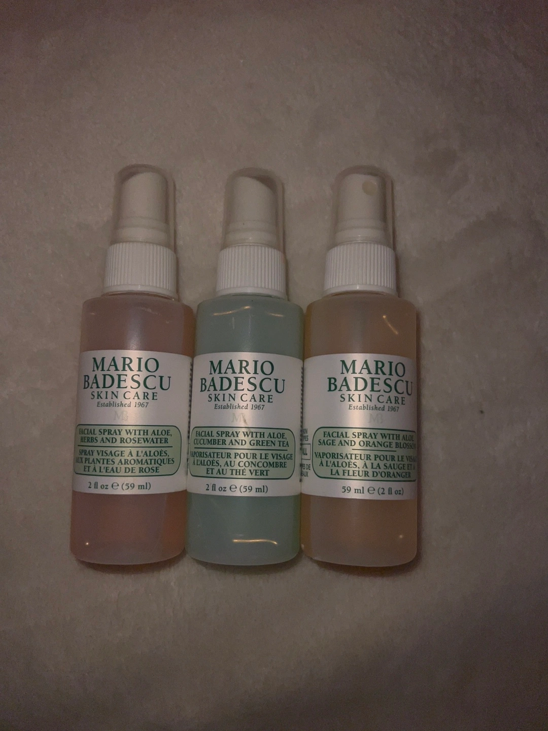 Three Mario Badescu facial sprays: Aloe, Herbs & Rosewater, Aloe, Cucumber & Green Tea, and Aloe, Sage & Orange Blossom. They are half used so I’m selling at a low price, they are very refreshing and hydrating 😊