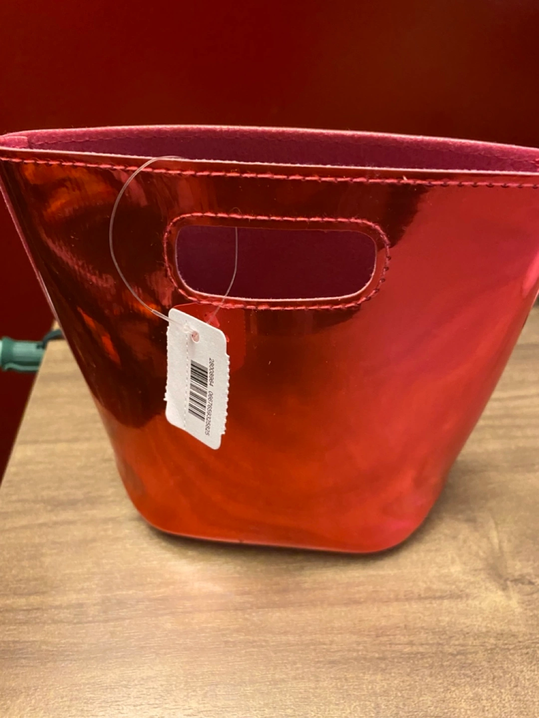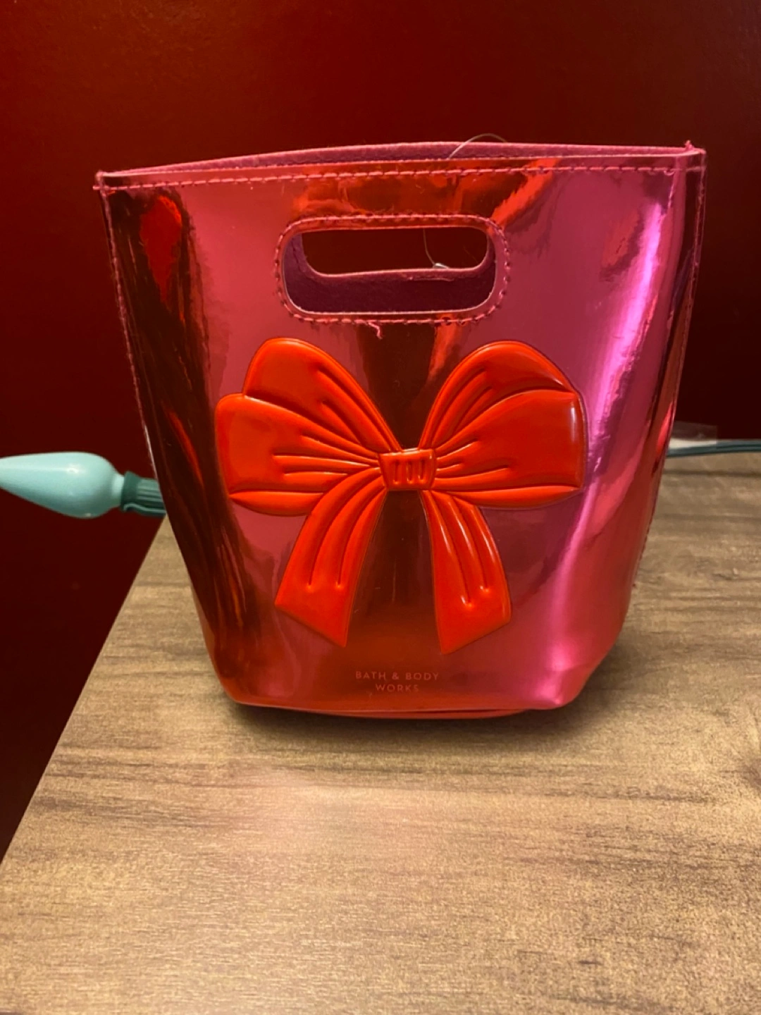 Small metallic pink bag with a red bow on the front. Has a handle at the top.
