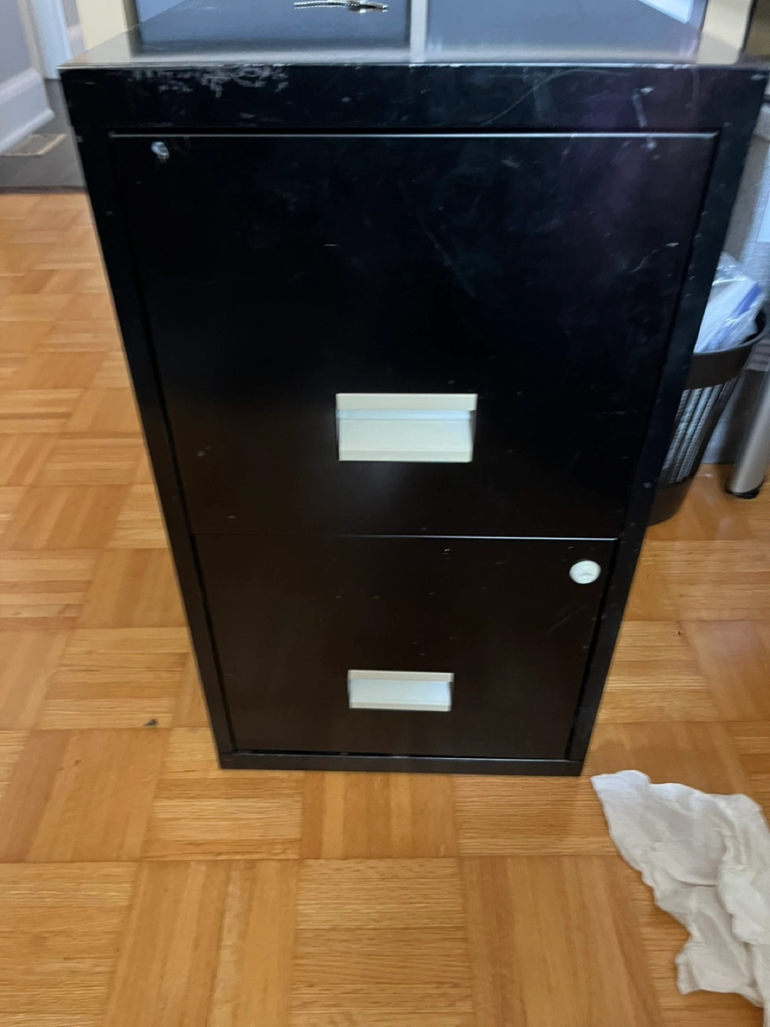 Black metal filing cabinet with two drawers and a key. The drawers run smoothly. Some scratches on the cabinet.