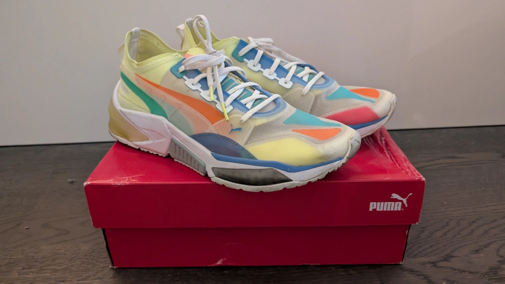 Multicoloured running shoes with a translucent upper; can switch up the appearance with a change of socks!