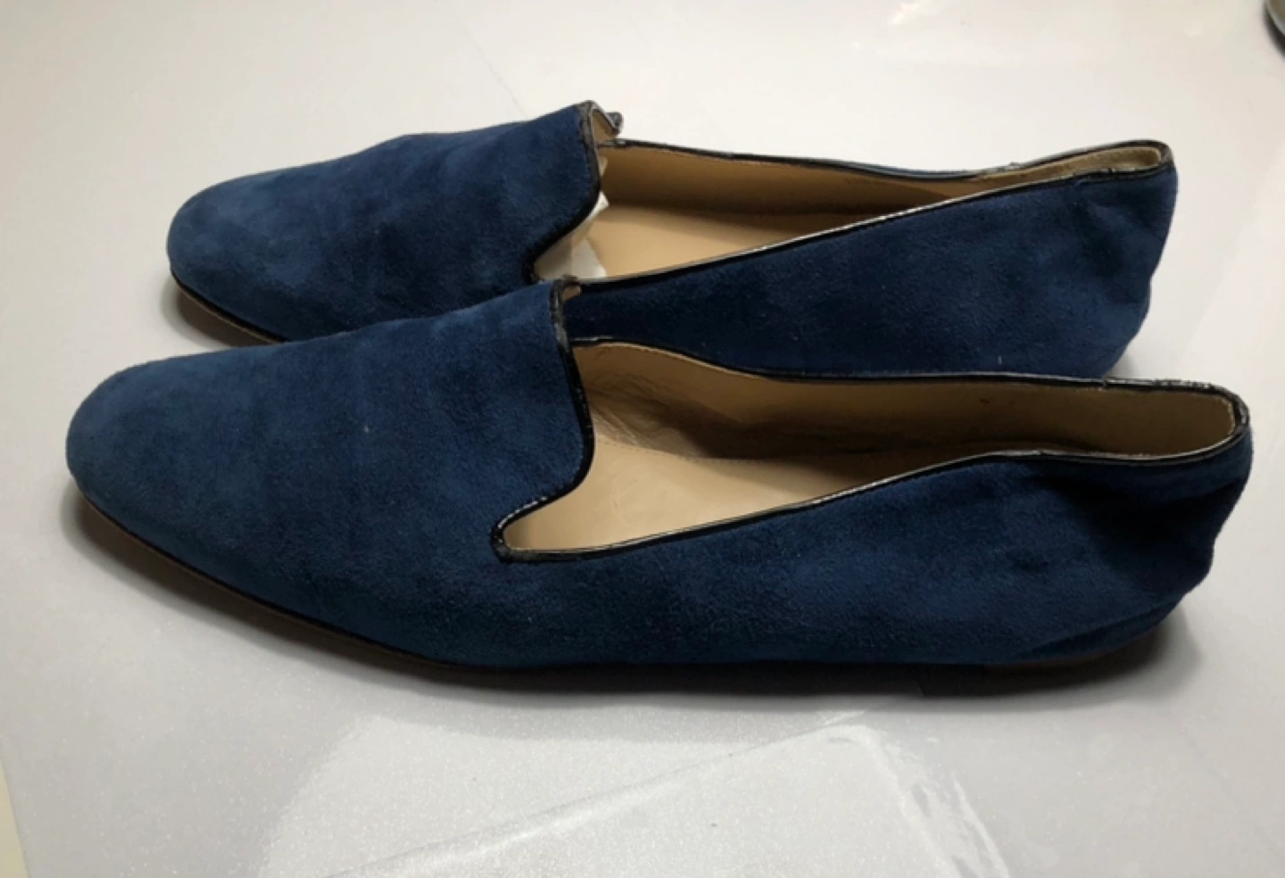 Suede loafers/slip on shoes in navy blue with a black trim. Made in Italy. Leather upper and lining.