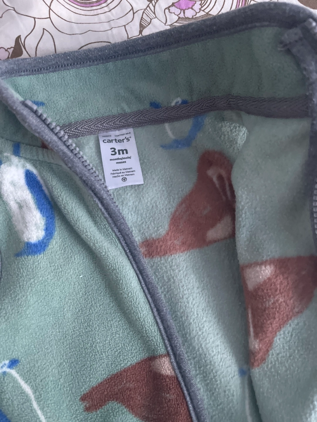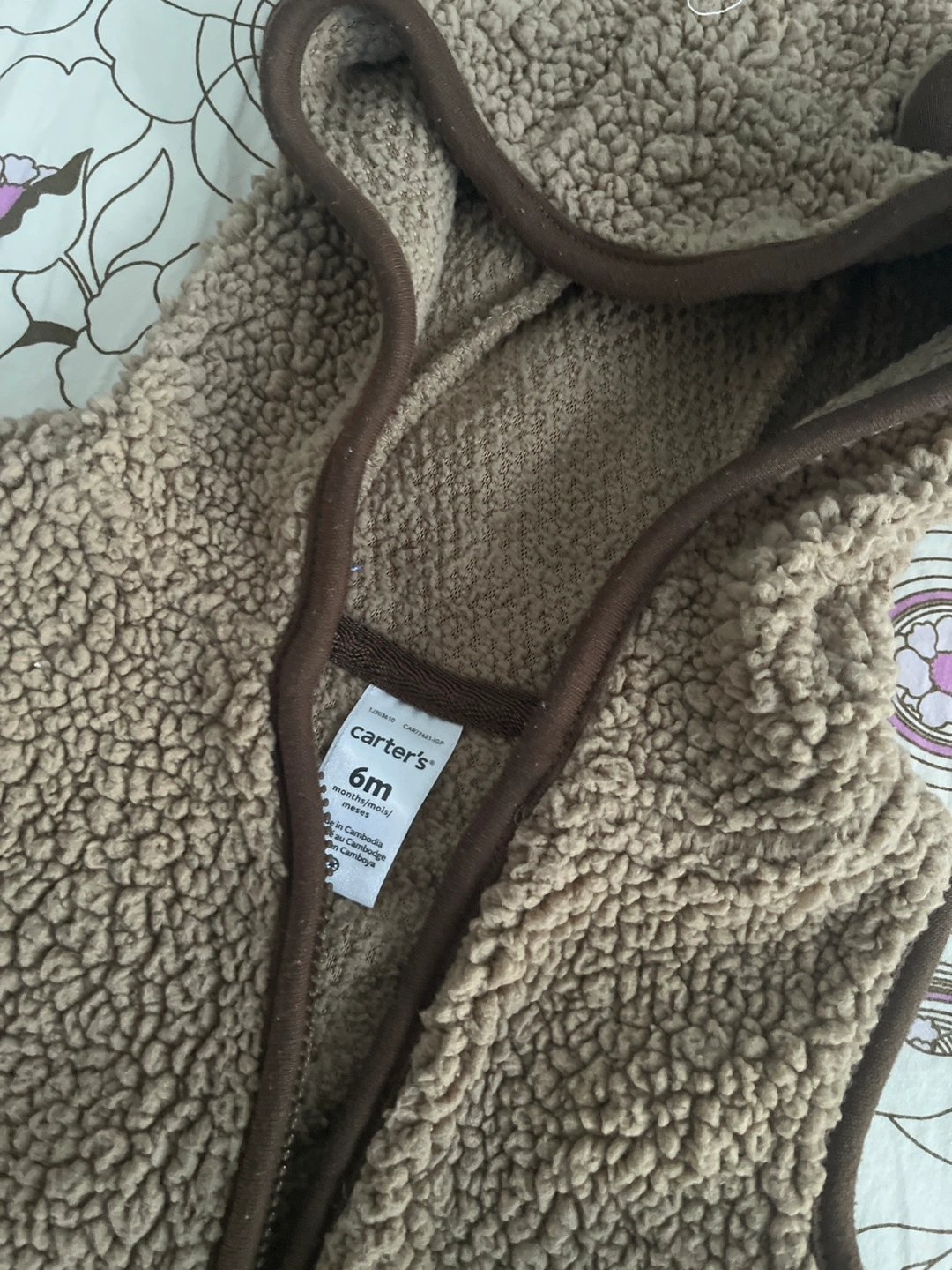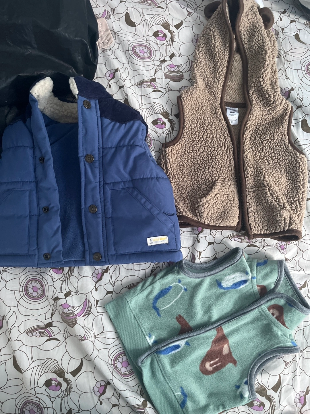 Bundle of 3 baby boy vests, size 6 and 3 months. Includes blue puffer vest, brown fleece vest with bear ears hood, and two green fleece vests.