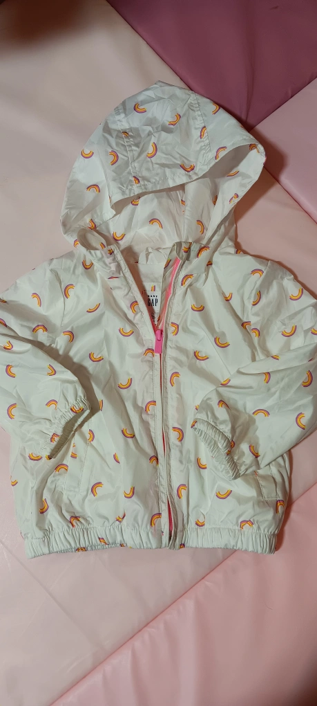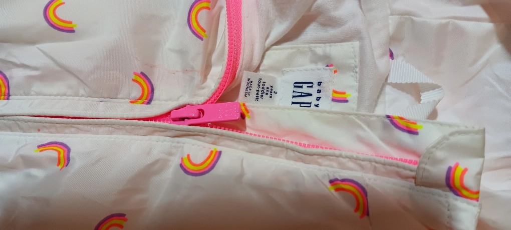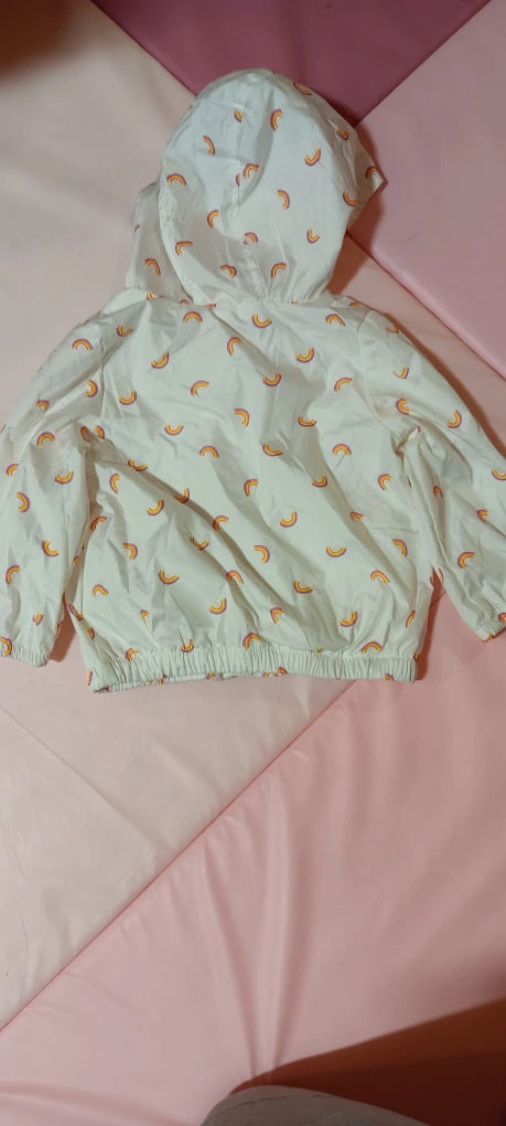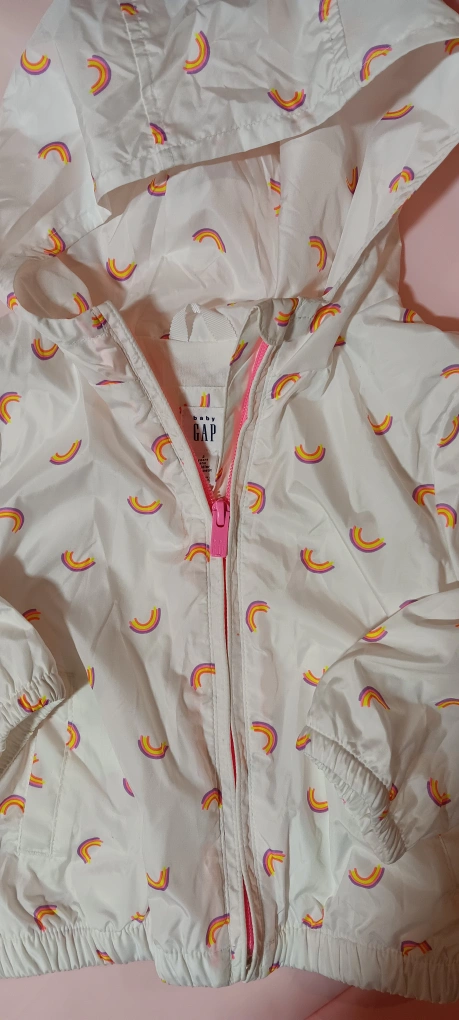 483White jacket with rainbow pattern, pink zipper, and hood.