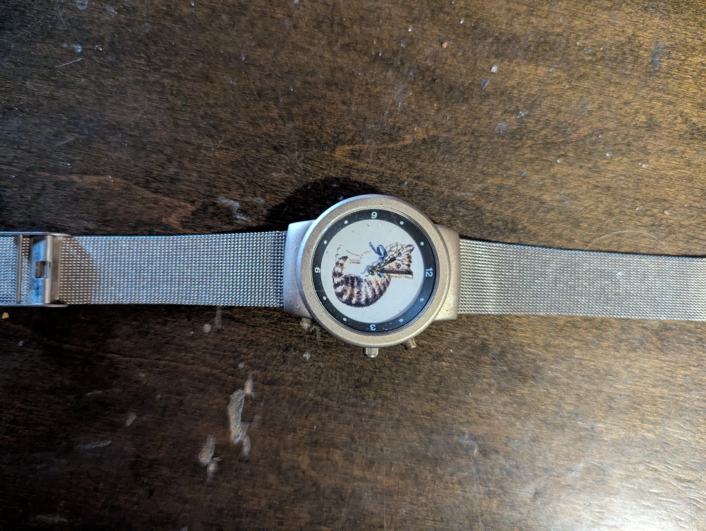 781Silver watch with metal band and cat design. Has new battery installed. message with interest please thanks firm