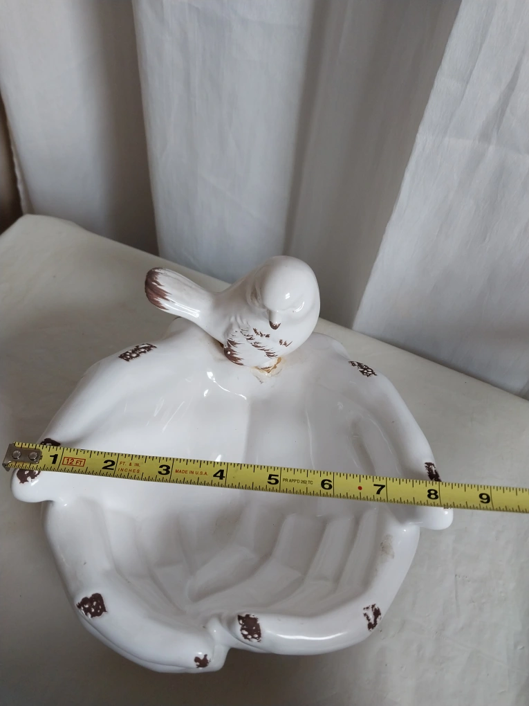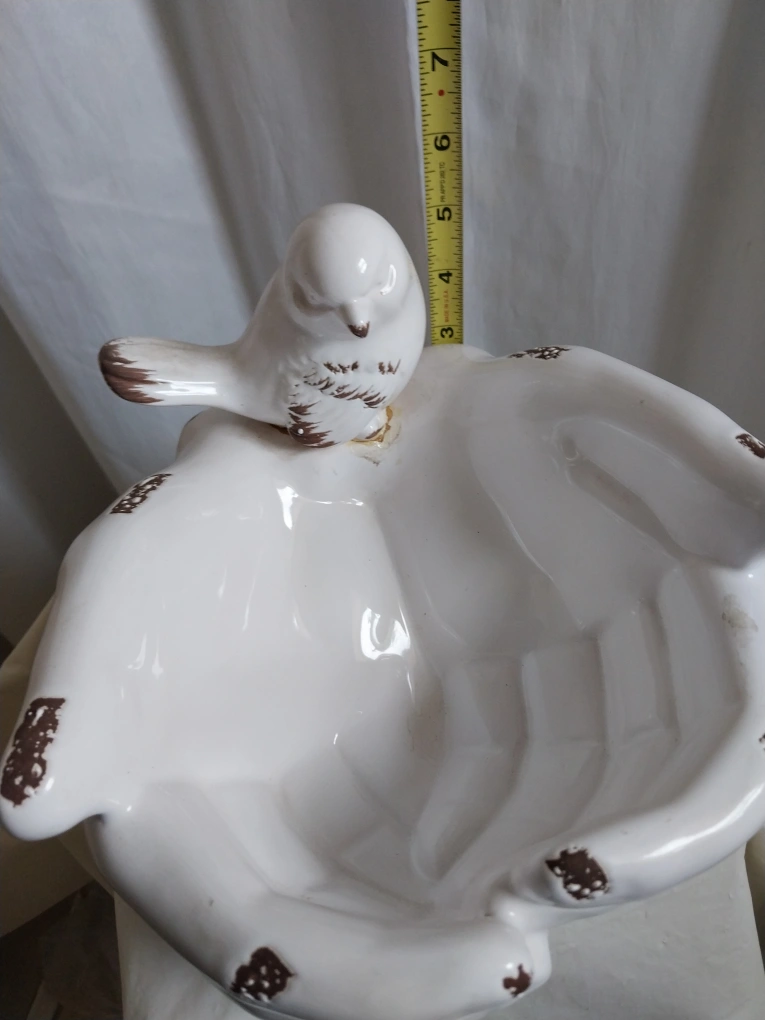 A ceramic dish in the shape of cupped hands with a bird perched on top. It is white with brown accents. The dish measures approximately 9 inches wide. Would look awesome as a catch-all on a foyer table or maybe a conversation piece on your coffee table.