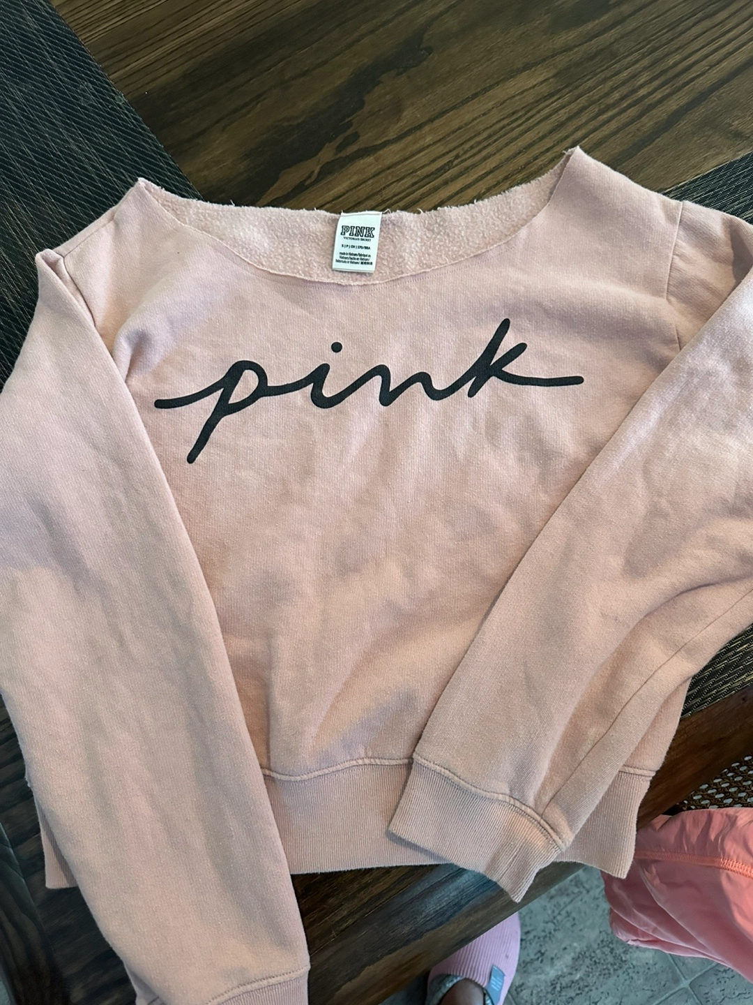 Pink Victoria's Secret pink sweater with long sleeves off shoulder wide neck a "pink" logo on the front.