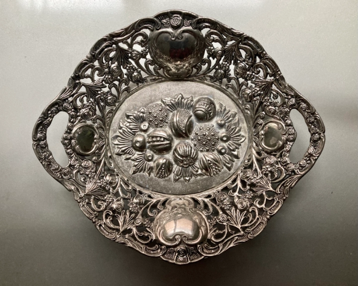 Ornate silver-plated fruit bowl with two handles. Features a beautiful embossed design with fruits and florals. Very unique piece. About 12”x10.5” including handles. Pick up in the Ossington and Davenport area.