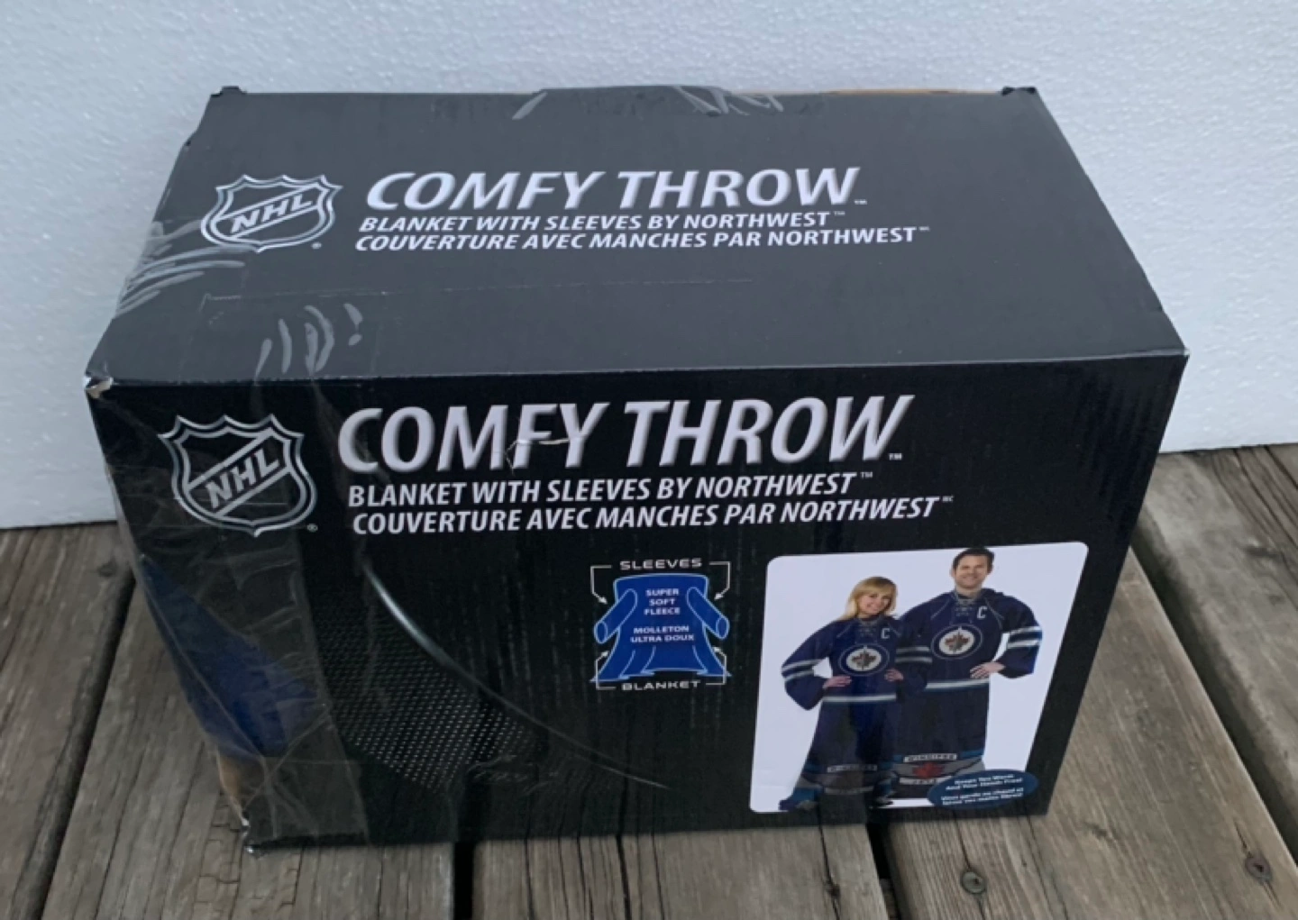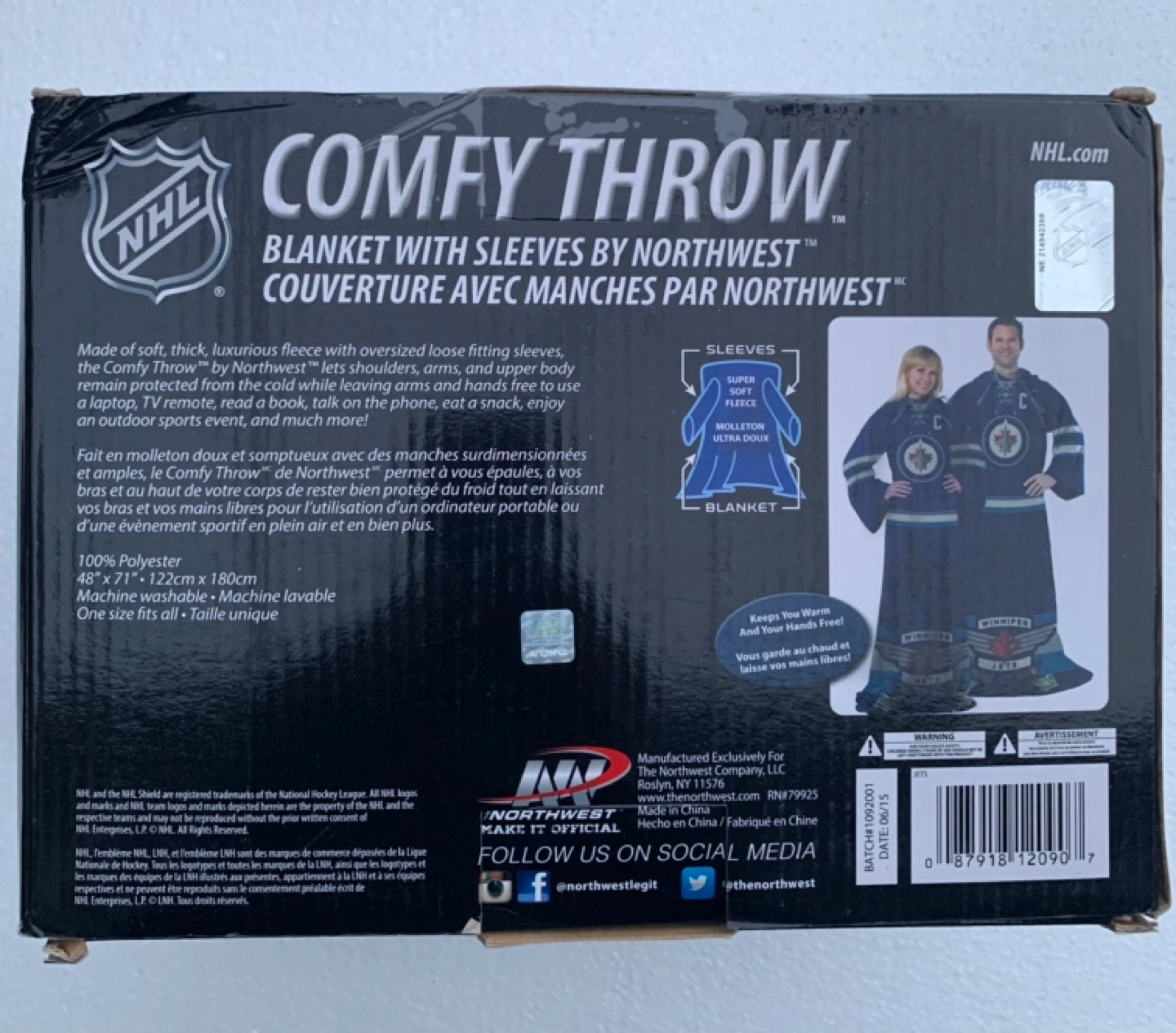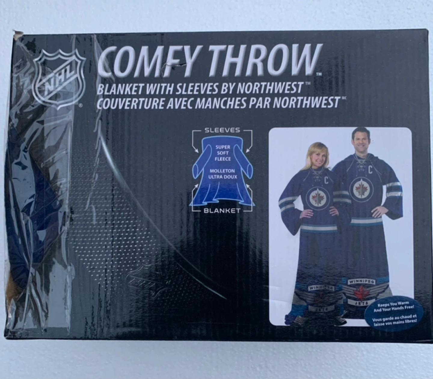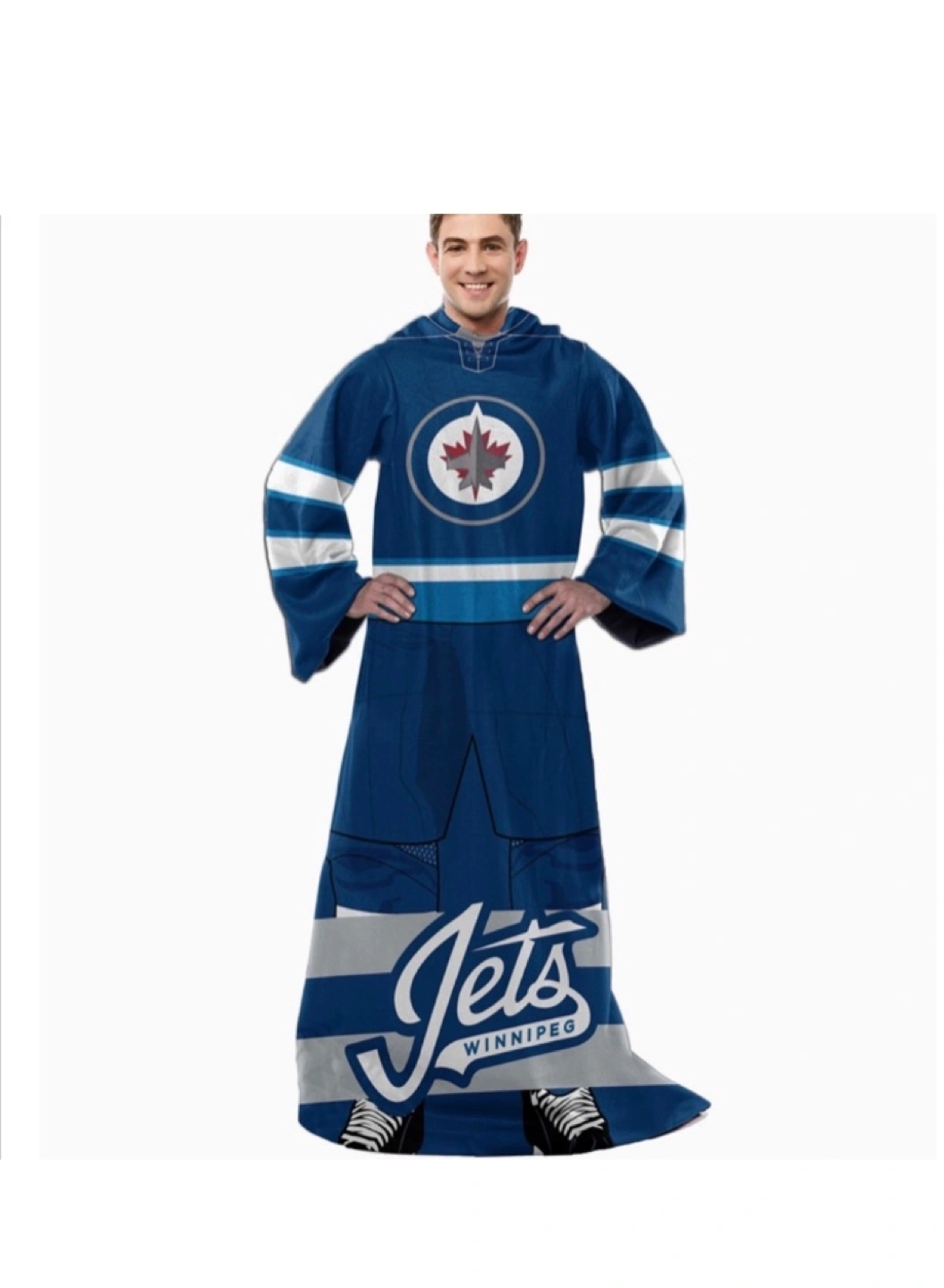 This Comfy Throw makes you feel like you are apart of your Winnipeg Jets team! Made of soft, thick luxurious fleece with oversized loose fitting sleeves, the comfy throw lets shoulders, arms and upper body remain protected from the cold while leaving arms and hands free to do anything you wish—indoor or outdoor!