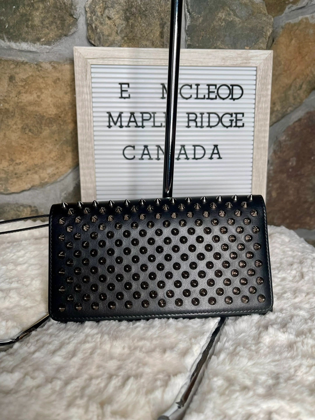Black leather wallet with silver spikes. Red interior. Made in Italy. Located in east Maple Ridge