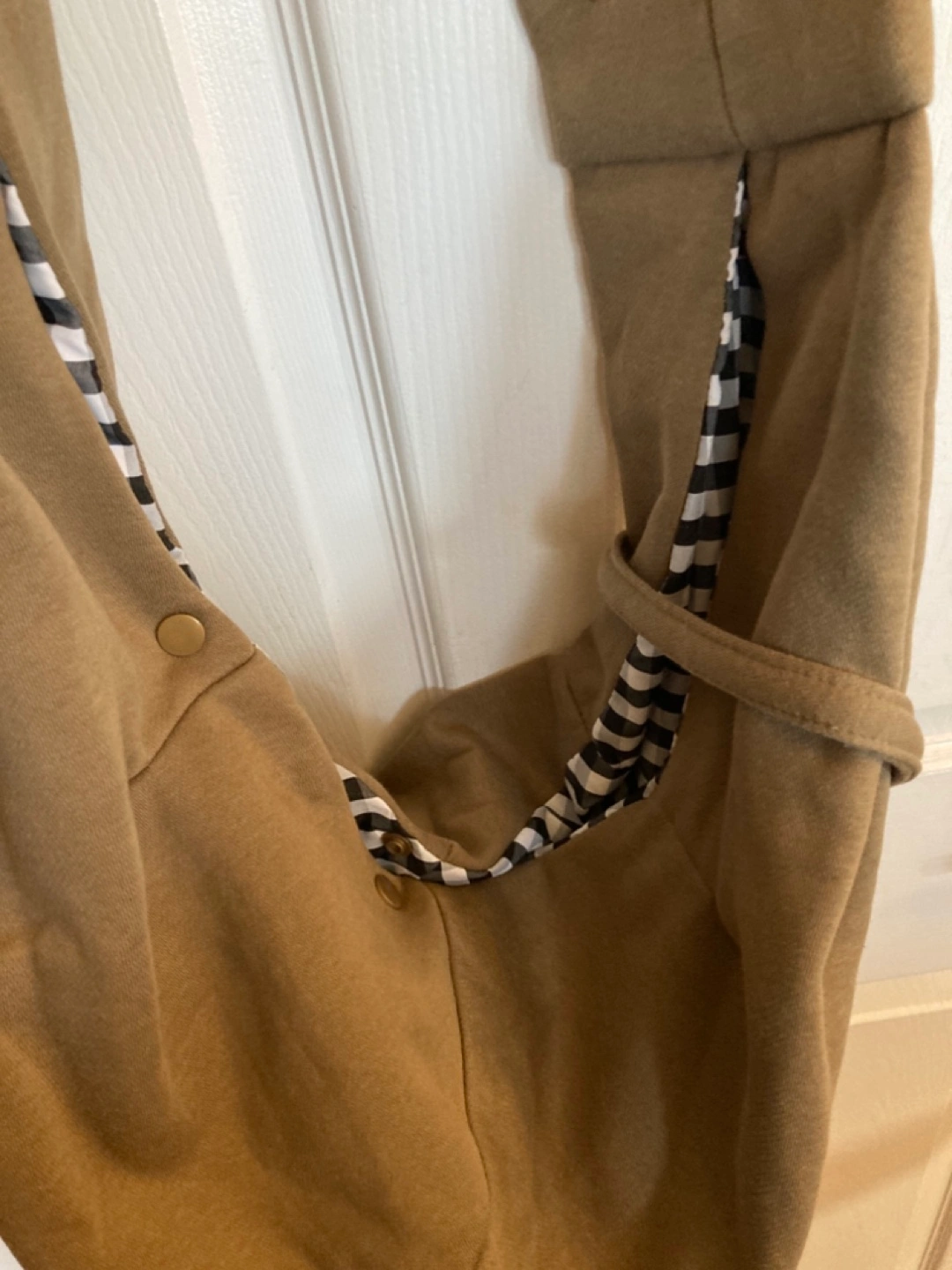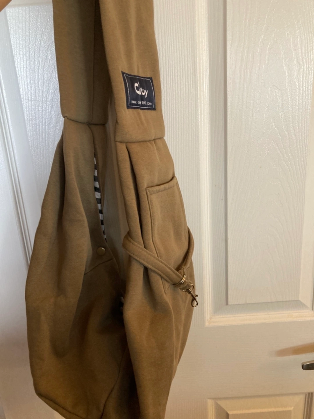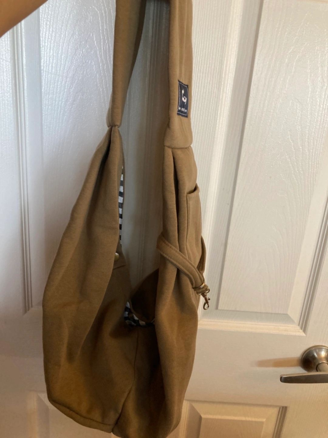 Brown pet carrier sling with black and white trim. Has a small pocket on the front where you can put your phone.