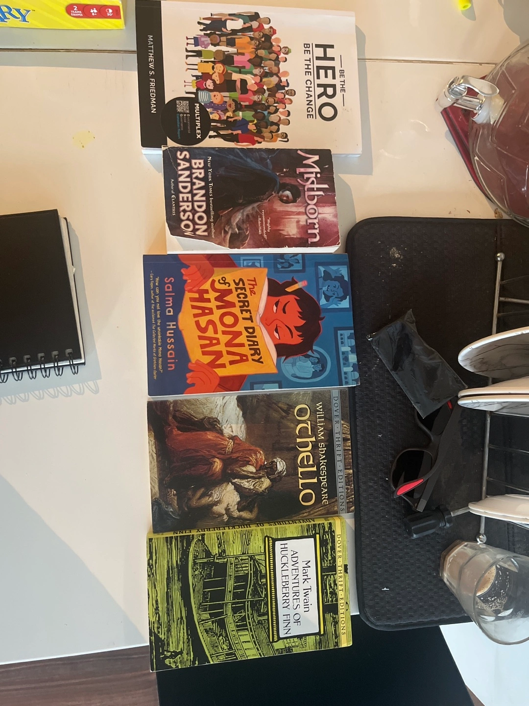 A collection of 5 paperback books, including: * The Secret Diary of Mona Hasan by Salma Hussain * Othello by William Shakespeare * Adventures of Huckleberry Finn by Mark Twain * Mistborn by Brandon Sanderson * Be the Hero: Be the Change by Matthew S. Friedman.