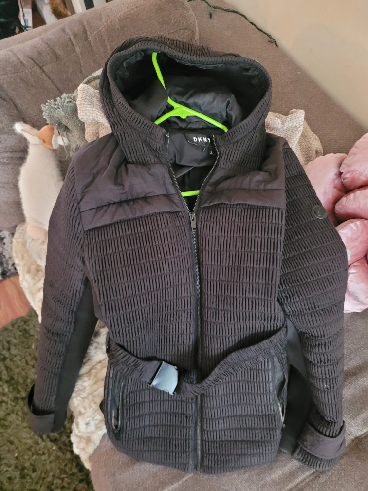 Black puffer jacket with a belt. Has a hood. Zipper closure. very slimming and flattering fit.