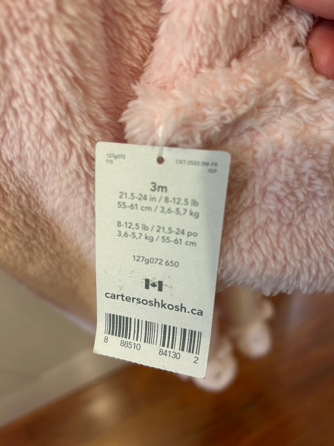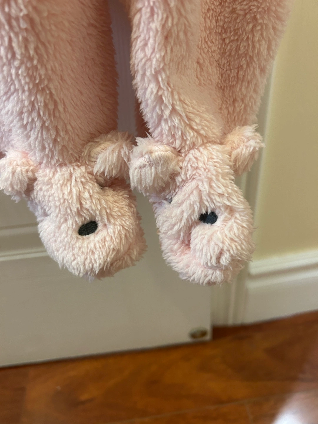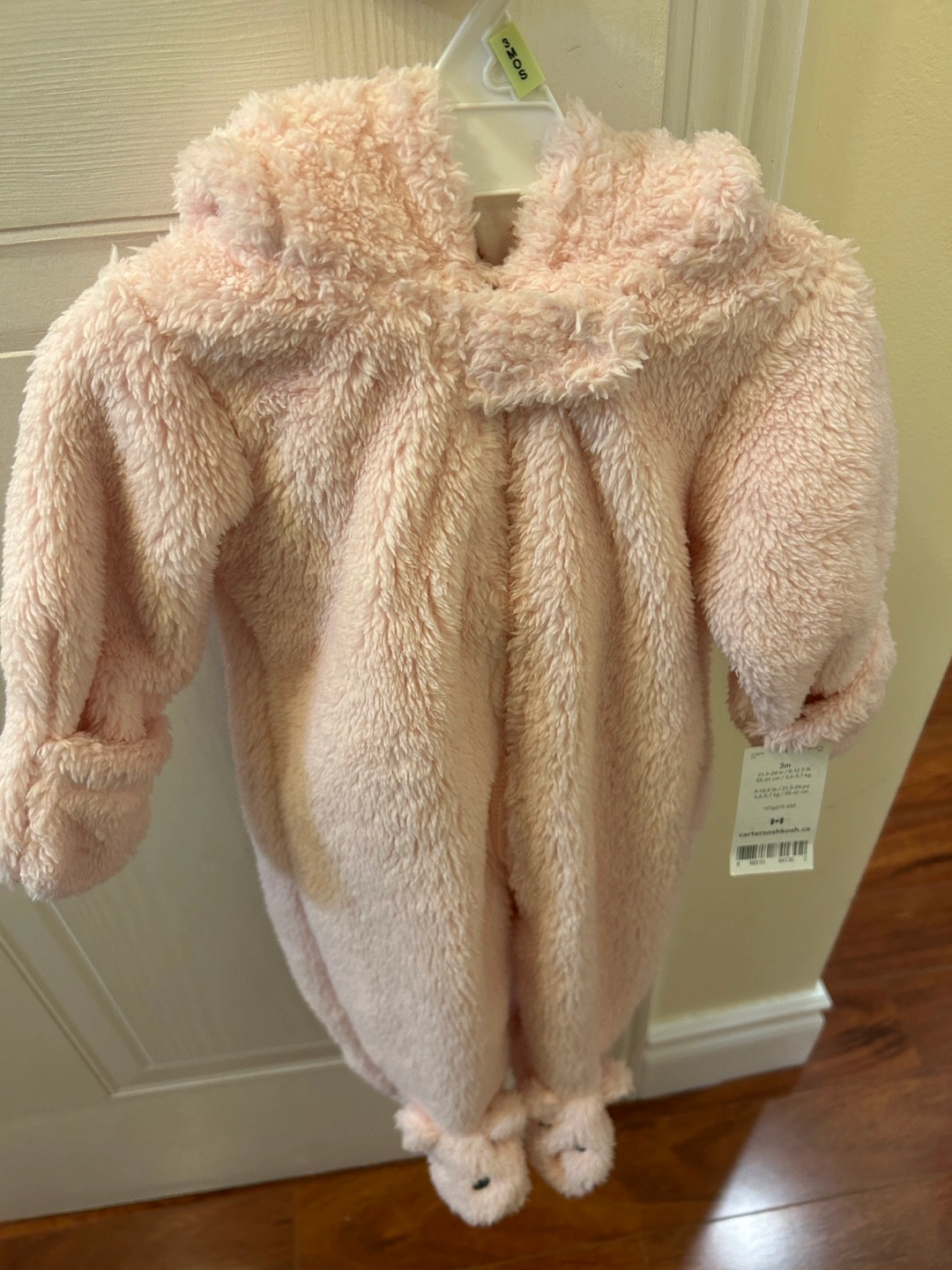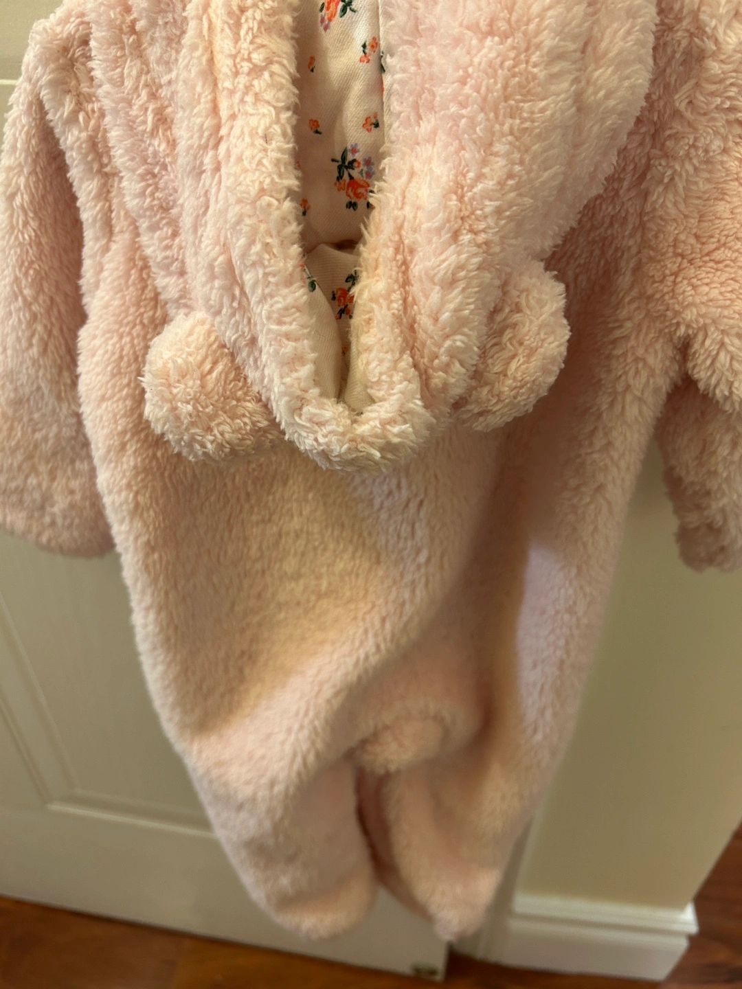 Fuzzy pink bear sleeper with hood, feet and ears. Closed mitt sleeves and closed feet. Size 3 months.
