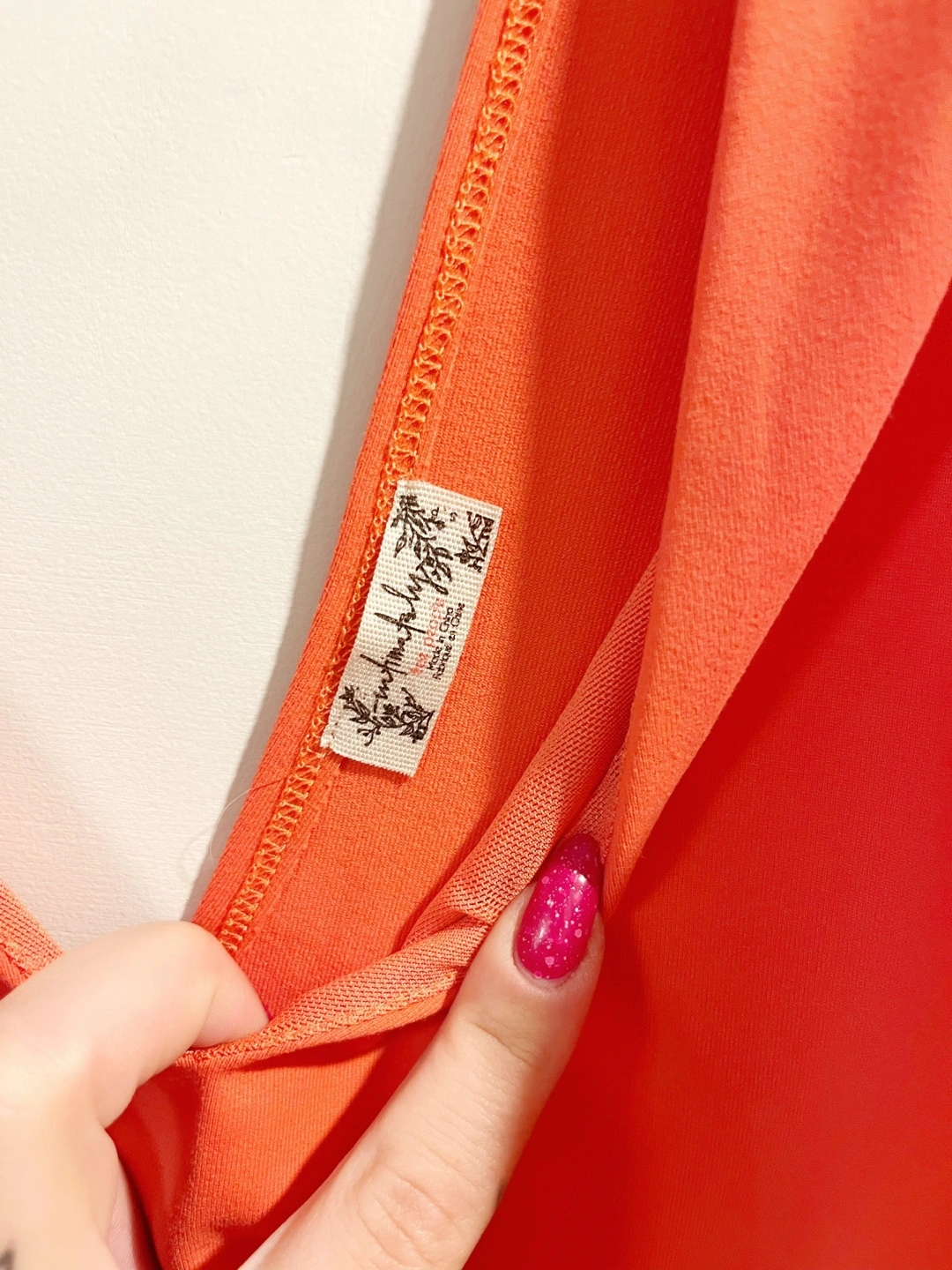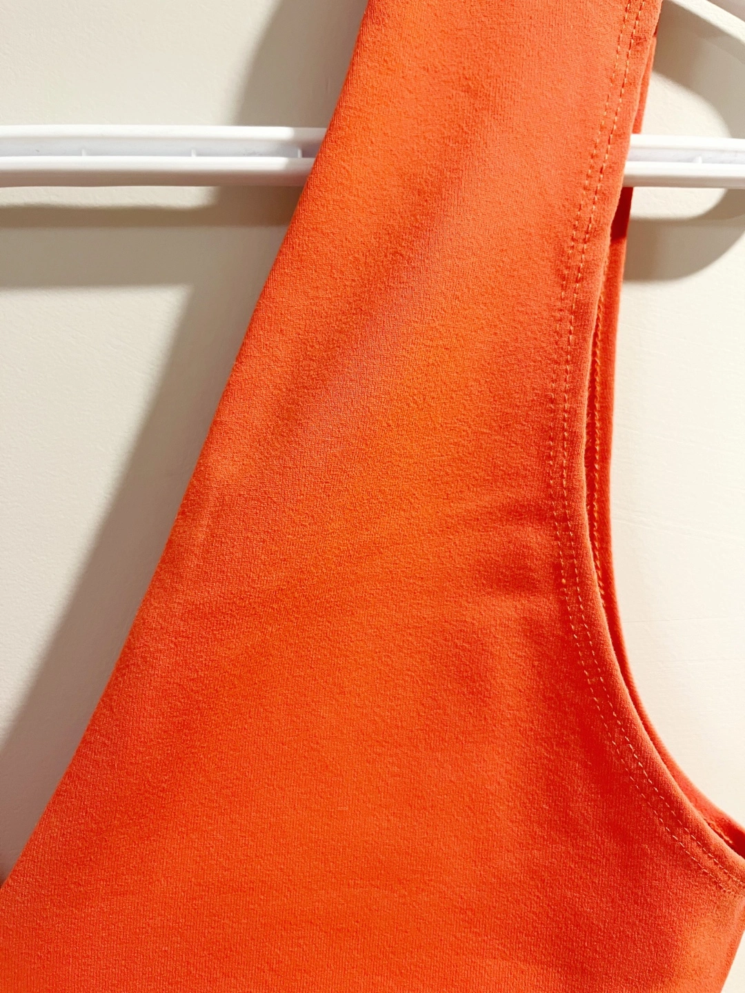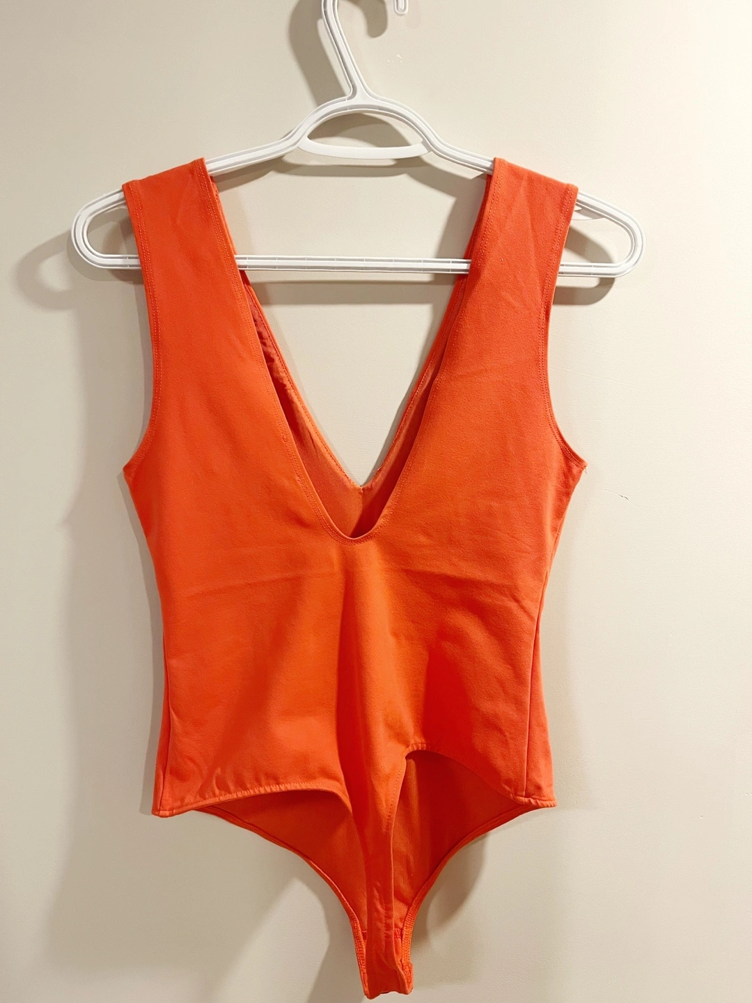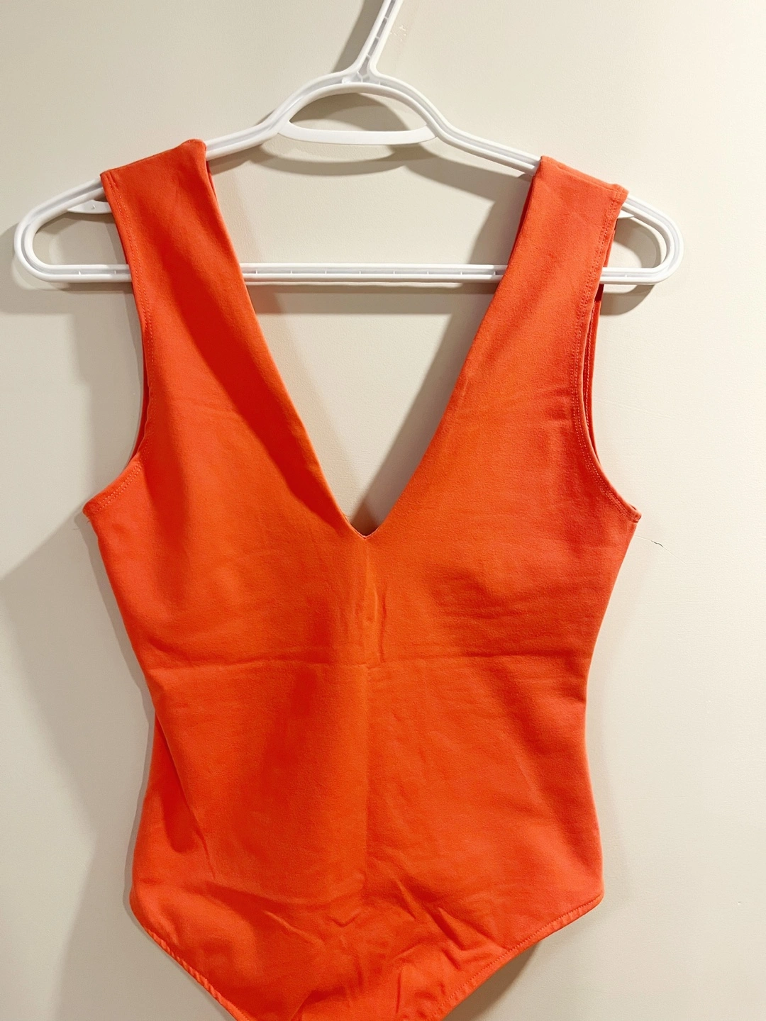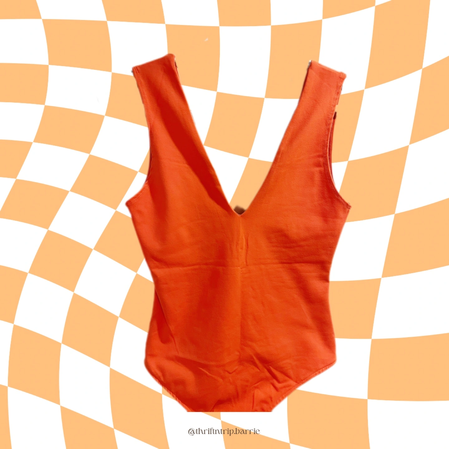65Orange bodysuit with a deep V-neckline. Sleeveless.