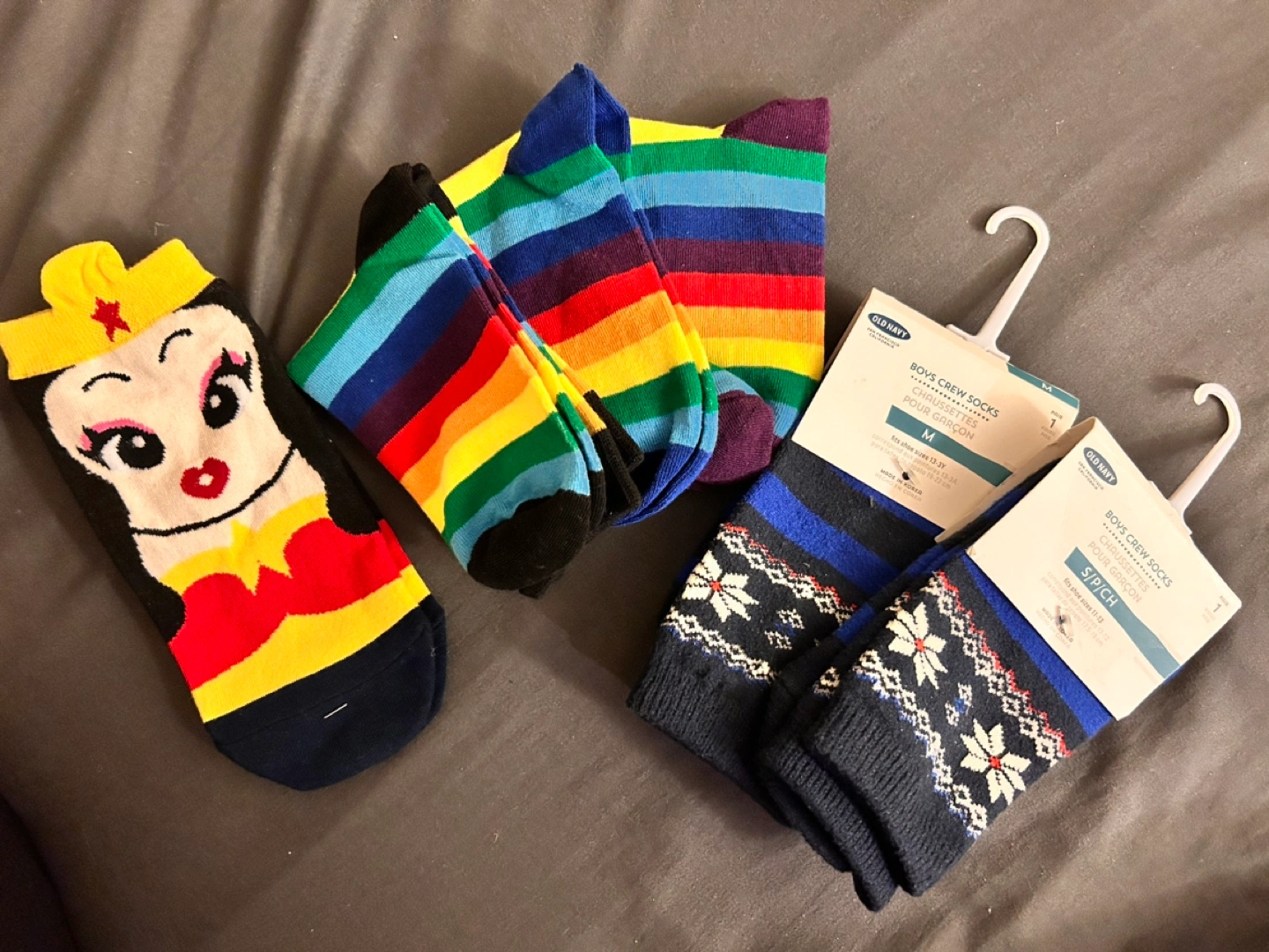 6 pairs of socks. Three rainbow socks and two blue and white patterned socks.
