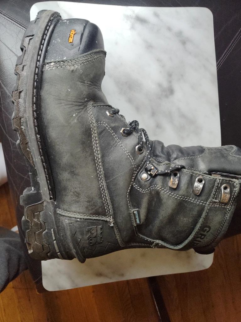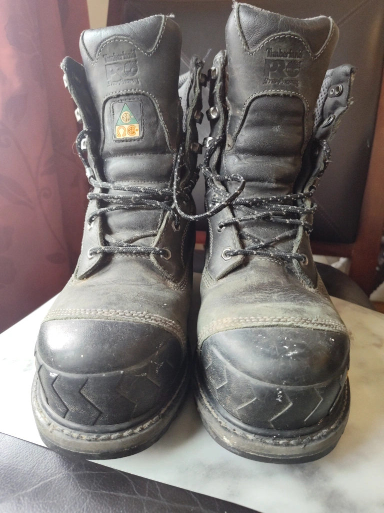 Black leather work boots with steel toe, waterproof, and grip technology. Size 8.5W.