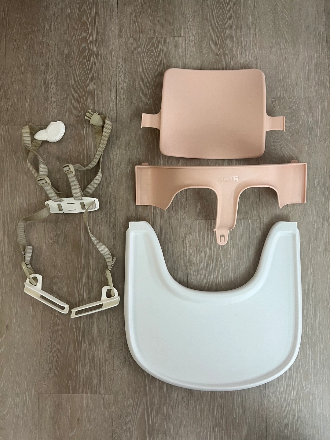 Stokke Tripp Trapp Baby Set includes harness, tray, and seat pad. Seat pad is blush pink.