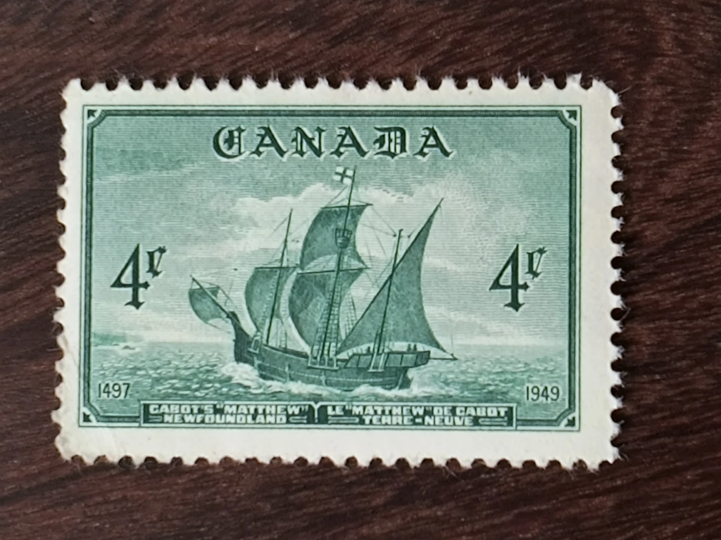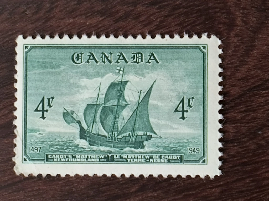 unused, Vintage Canadian stamp featuring a ship. Issued in 1949 to commemorate the 400th anniversary of John Cabot's voyage to Newfoundland.